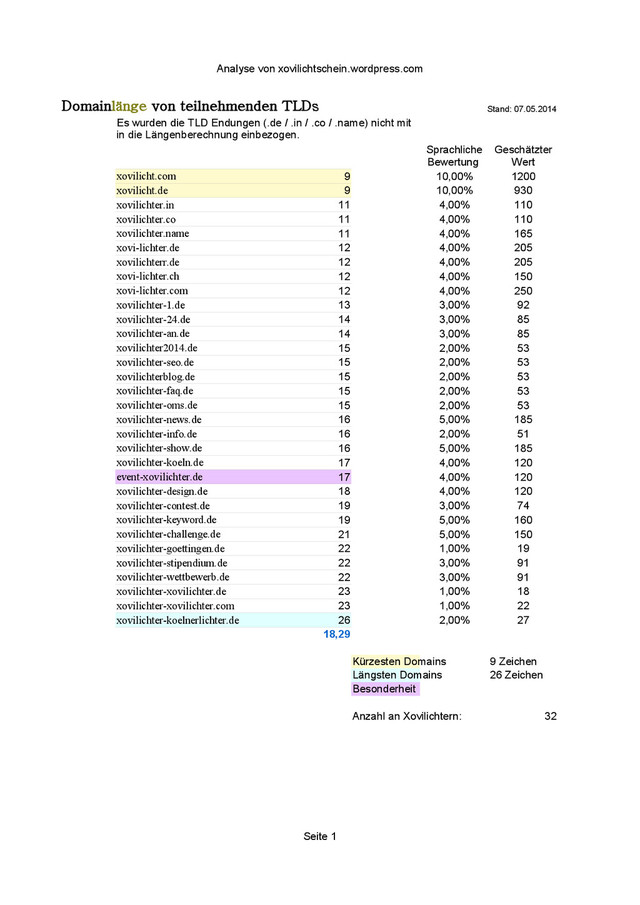 1200 xovilicht.de 9 10,00% 930 xovilichter.in 11 4,00% 110 xovilichter.co 11 4,00% 110 xovilichter.name 11 4,00% 165 xovi-lichter.de 12 4,00% 205 xovilichterr.de 12 4,00% 205 xovi-lichter.ch 12 4,00% 150 xovi-lichter.com 12 4,00% 250 xovilichter-1.de 13 3,00% 92 xovilichter-24.de 14 3,00% 85 xovilichter-an.de 14 3,00% 85 xovilichter2014.de 15 2,00% 53 xovilichter-seo.de 15 2,00% 53 xovilichterblog.de 15 2,00% 53 xovilichter-faq.de 15 2,00% 53 xovilichter-oms.de 15 2,00% 53 xovilichter-news.de 16 5,00% 185 xovilichter-info.de 16 2,00% 51 xovilichter-show.de 16 5,00% 185 xovilichter-koeln.de 17 4,00% 120 event-xovilichter.de 17 4,00% 120 xovilichter-design.de 18 4,00% 120 xovilichter-contest.de 19 3,00% 74 xovilichter-keyword.de 19 5,00% 160 xovilichter-challenge.de 21 5,00% 150 xovilichter-goettingen.de 22 1,00% 19 xovilichter-stipendium.de 22 3,00% 91 xovilichter-wettbewerb.de 22 3,00% 91 xovilichter-xovilichter.de 23 1,00% 18 xovilichter-xovilichter.com 23 1,00% 22 xovilichter-koelnerlichter.de 26 2,00% 27 18,29 Kürzesten Domains 9 Zeichen Längsten Domains 26 Zeichen Besonderheit Anzahl an Xovilichtern: 32 Domainlänge von teilnehmenden TLDs Es wurden die TLD Endungen (.de / .in / .co / .name) nicht mit in die Längenberechnung einbezogen. Sprachliche Bewertung Geschätzter Wert