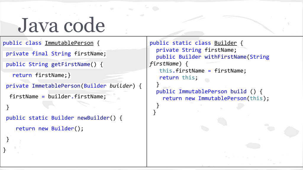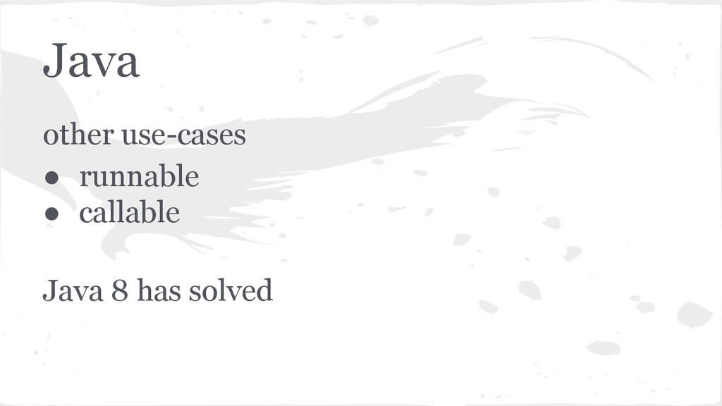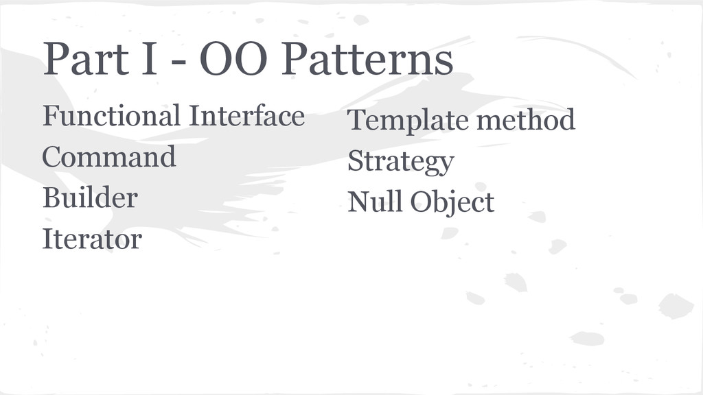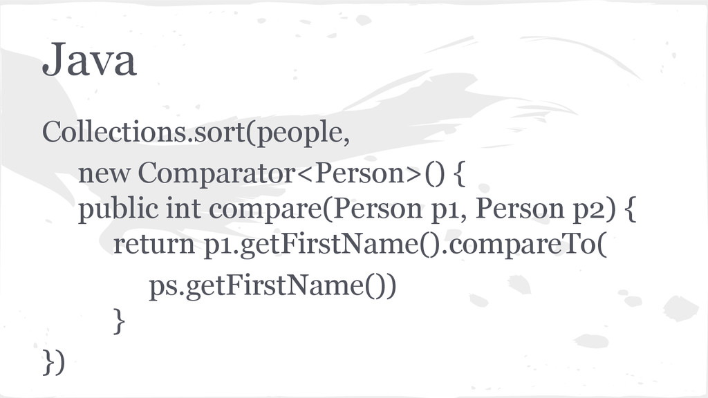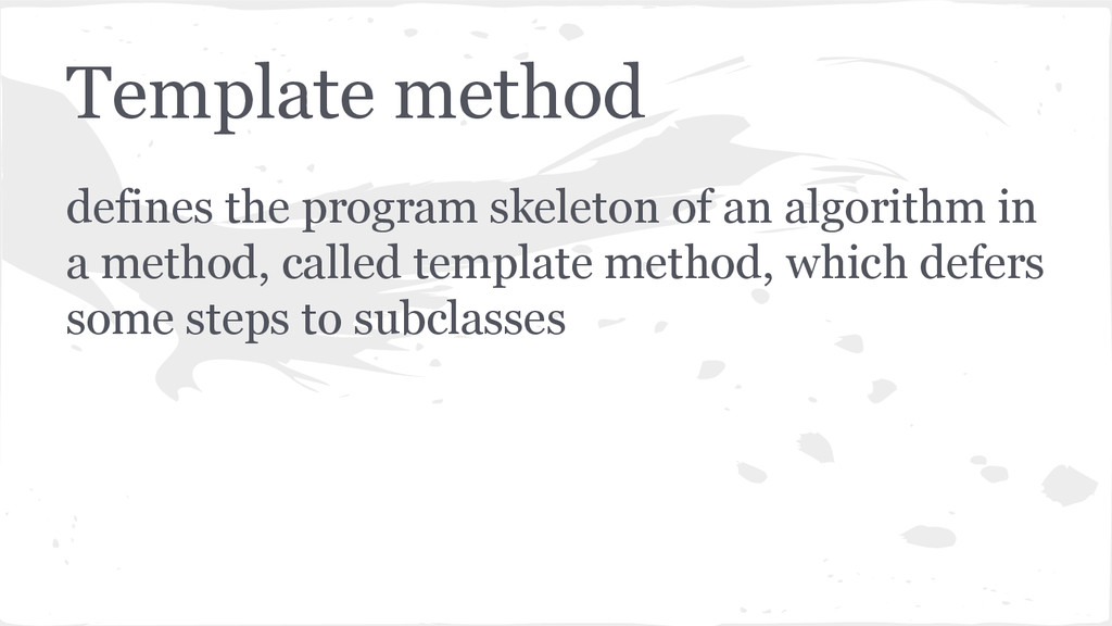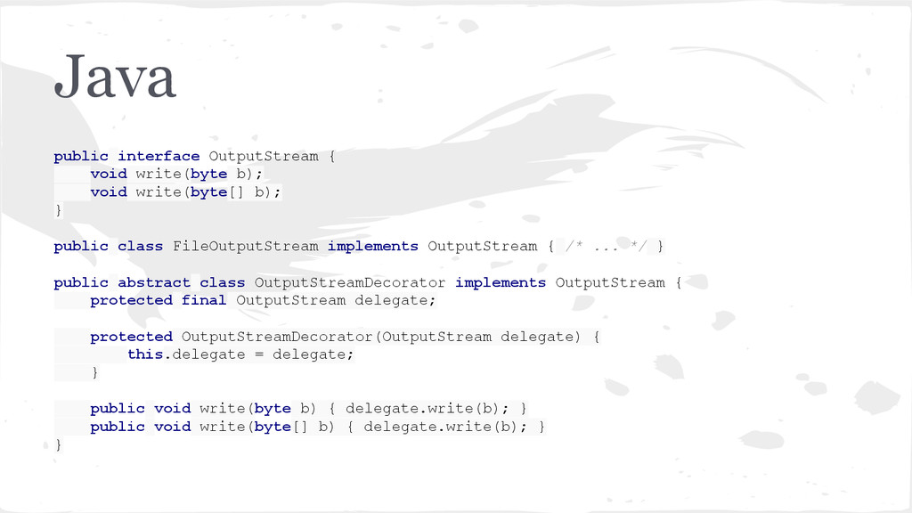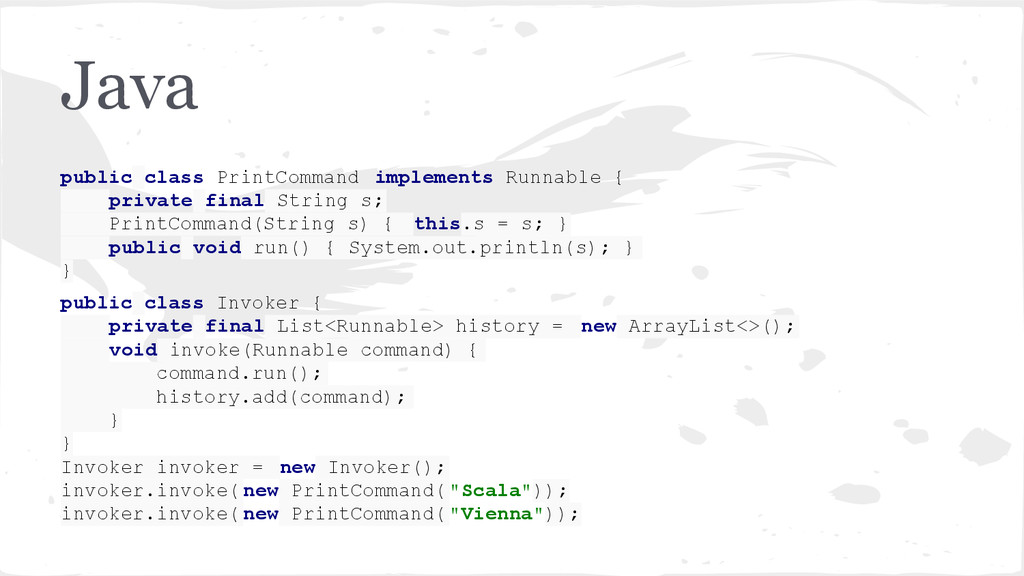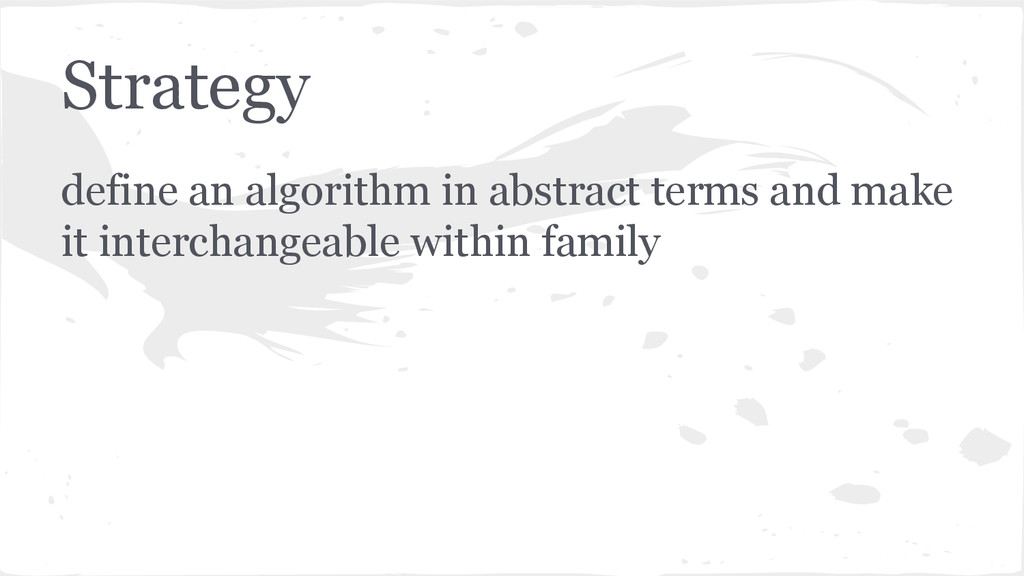 } public class Add implements Strategy { public int compute(int a, int b) { return a + b; } } public class Multiply implements Strategy { public int compute(int a, int b) { return a * b; } } public class Context { private final Strategy strategy; public Context(Strategy strategy) { this.strategy = strategy; } public void use(int a, int b) { strategy.compute(a, b); } } new Context(new Multiply()).use( 2, 3);