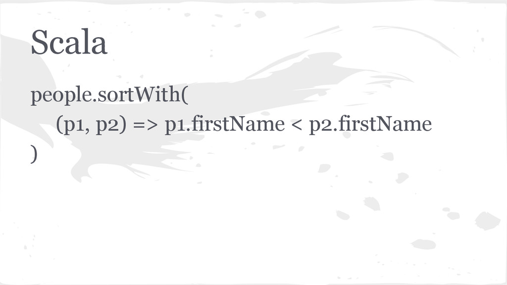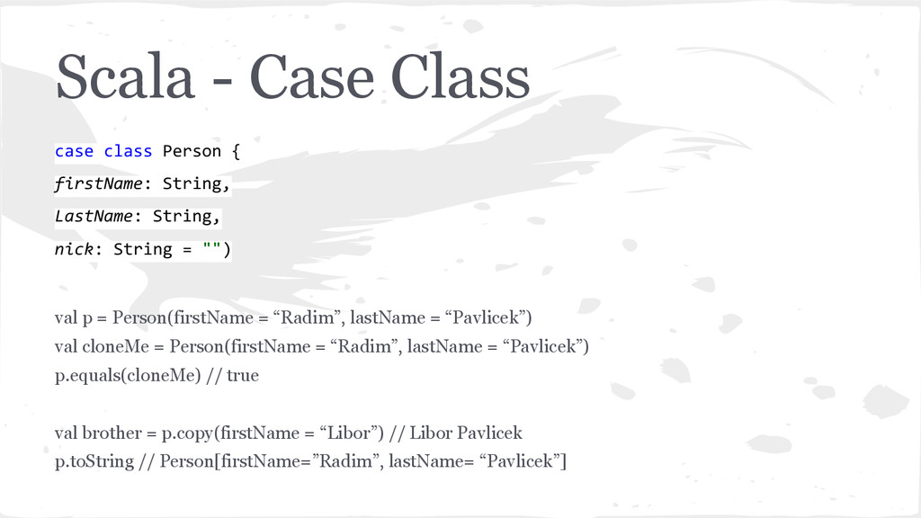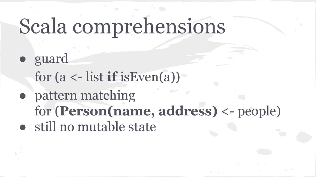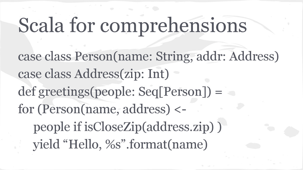 class Address(zip: Int) def greetings(people: Seq[Person]) = for (Person(name, address) <- people if isCloseZip(address.zip) ) yield “Hello, %s”.format(name)