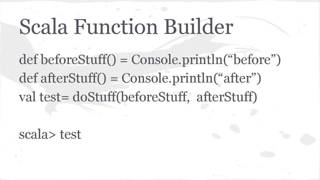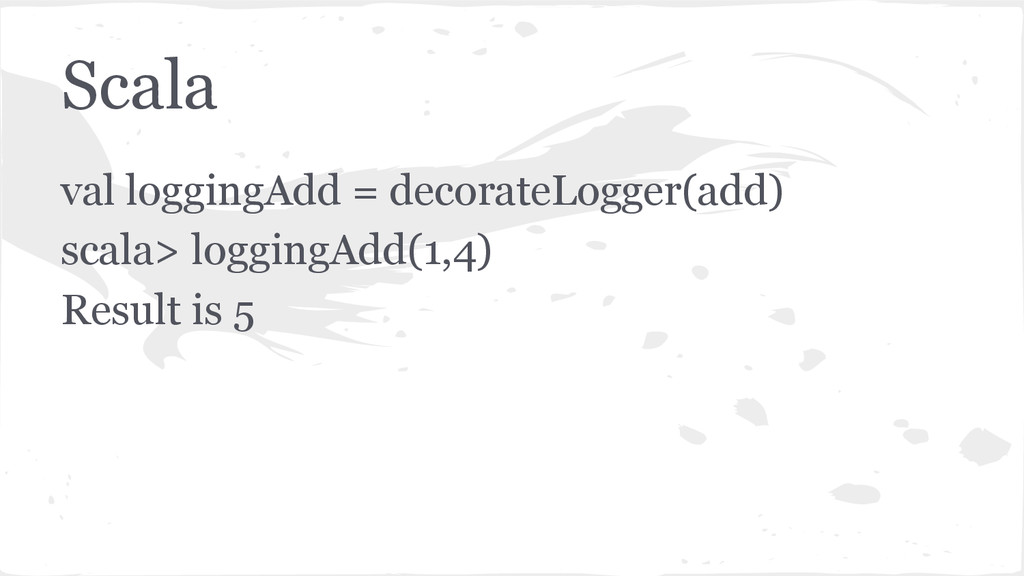 def decorateLogger(calcF: (Int, Int) => Int) = (a: Int, b: Int) => { val result = calcF(a, b) println(“Result is: “ + result) // here it comes result }