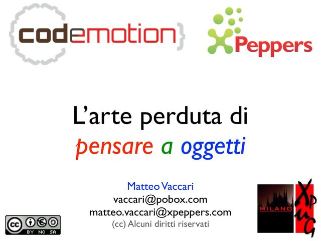 in Informatica 2003 Extreme Programming! 2007 Team Orione in Sourcesense → XPeppers 2009 Workshop su Design Emergente FC 2011 Object Thinking 2012 Success! APPASSIONATO HOTSHOT FORMALISTA XPer Una storia... L’ultimo progetto consegnato dal “mio” team XP: 1400 giornate su nove mesi, messo in produzione con pochissimi difetti e nei tempi previsti! ...che prosegue...