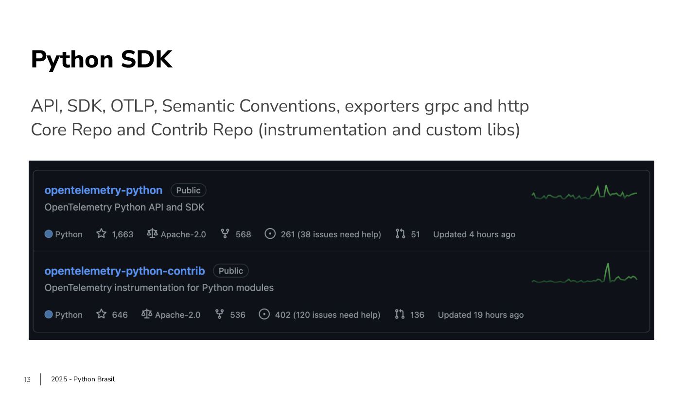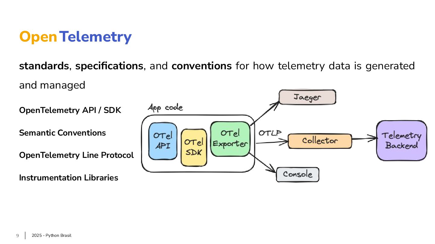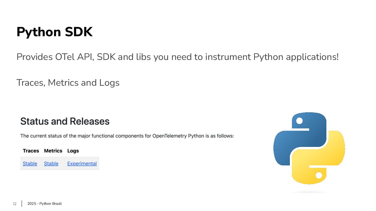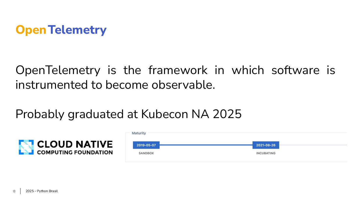 OpenTelemetry Python is a SIG (Special Interest Group) that develops and manages the Python implementation of OpenTelemetry, the second-highest velocity project in the CNCF landscape (only behind Kubernetes). This group delivers a vendor-neutral observability solution, building over 80 Python packages and counting more than 500M downloads per month. This makes it a peculiar project with interesting technical challenges and scales to share the lessons learned. Presented with Emidio Neto at Python Brasil 2025.