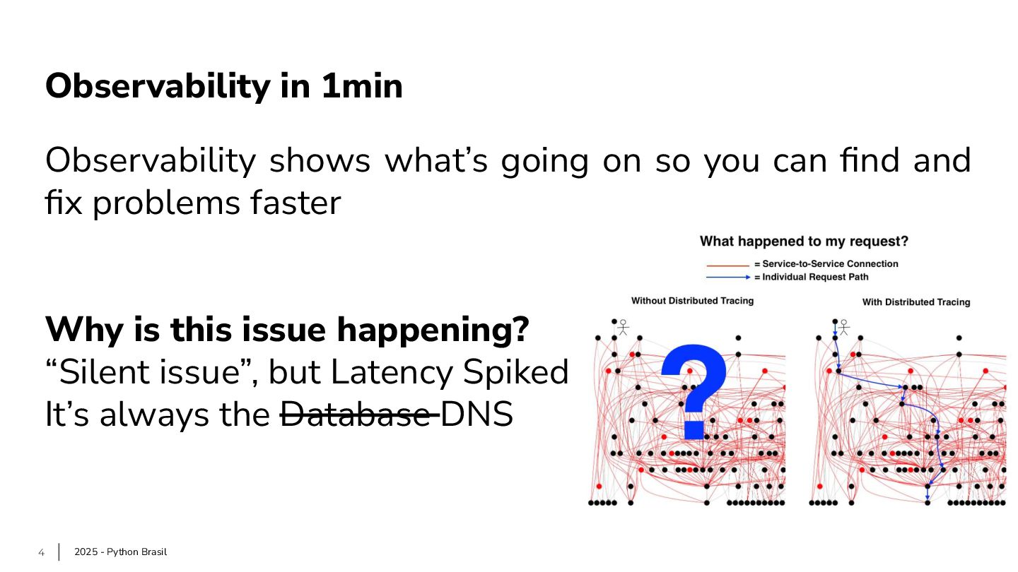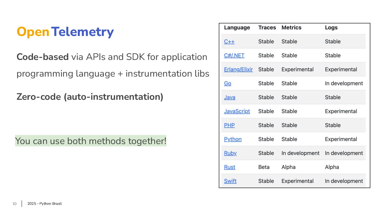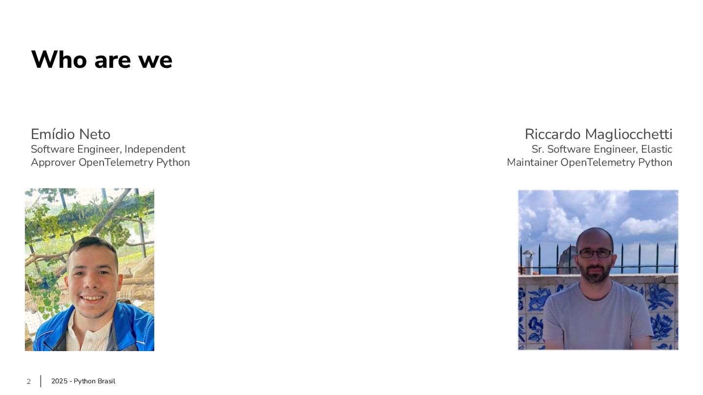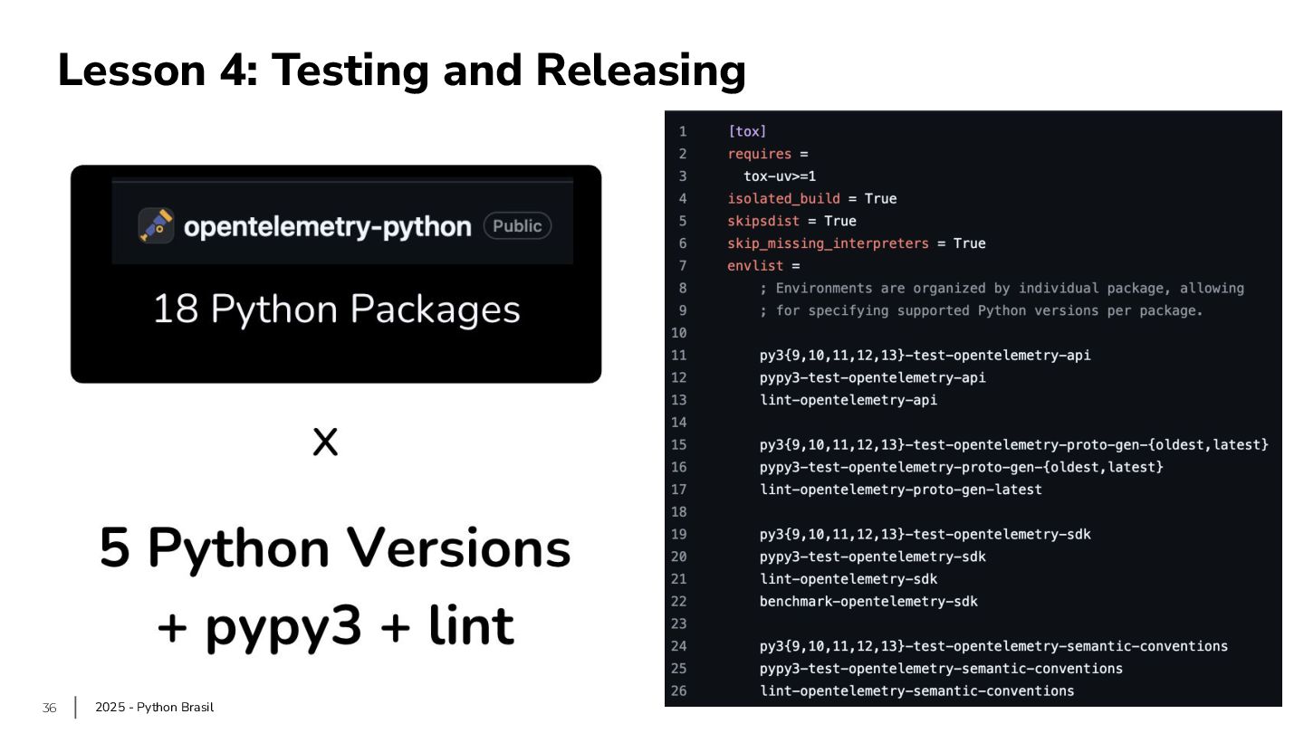 OpenTelemetry Python is a SIG (Special Interest Group) that develops and manages the Python implementation of OpenTelemetry, the second-highest velocity project in the CNCF landscape (only behind Kubernetes). This group delivers a vendor-neutral observability solution, building over 80 Python packages and counting more than 500M downloads per month. This makes it a peculiar project with interesting technical challenges and scales to share the lessons learned. Presented with Emidio Neto at Python Brasil 2025.