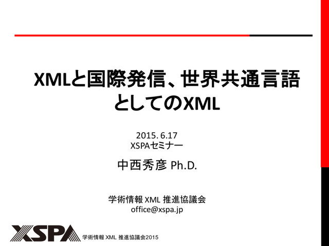 学術情報 XML 推進協議会2015 XMLと国際発信、世界共通言語 としてのXML 2015. 6.17 XSPAセミナー 中西秀彦 Ph.D.