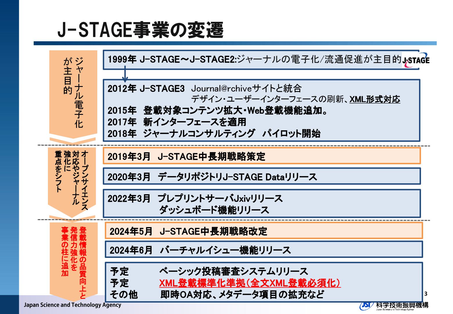 2012年 J-STAGE3 Journal@rchiveサイトと統合 デザイン・ユーザーインターフェースの刷新、XML形式対応 2015年 登載対象コンテンツ拡大・Web登載機能追加。 2017年 新インターフェースを適用 2018年 ジャーナルコンサルティング
