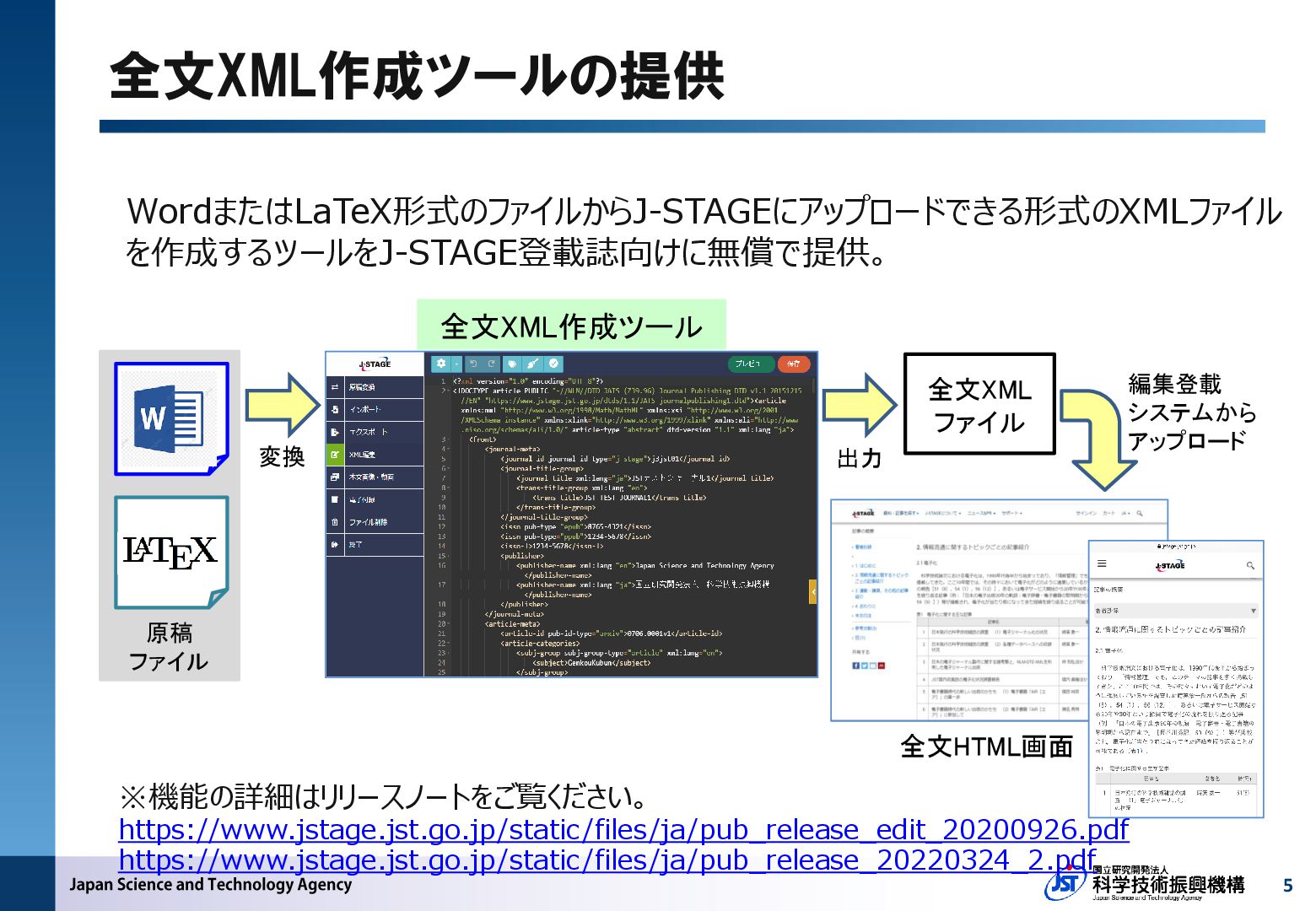 J-STAGEのXML推進の経緯 2004年 J-STAGE2システム運用開始 全文HTML公開機能をリリース XML推進の年表 4 2019年 JATSバージョンアップ(0.4→1.1)対応 2020年 全文XML作成ツールリリース