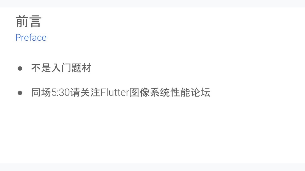 前言 • 不是入门题材 • 同场5:30请关注Flutter图像系统性能论坛 Preface