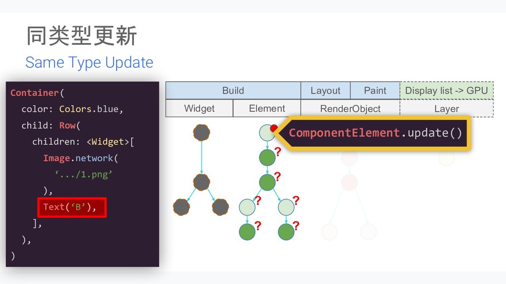 Layer Container( color: Colors.blue, child: Row( children: <Widget>[ Image.network( ‘.../1.png’ ), Text(‘B’), ], ), ) Text(‘B’), Same Type Update ComponentElement.update() ? ? ? ? ? ? 同类型更新