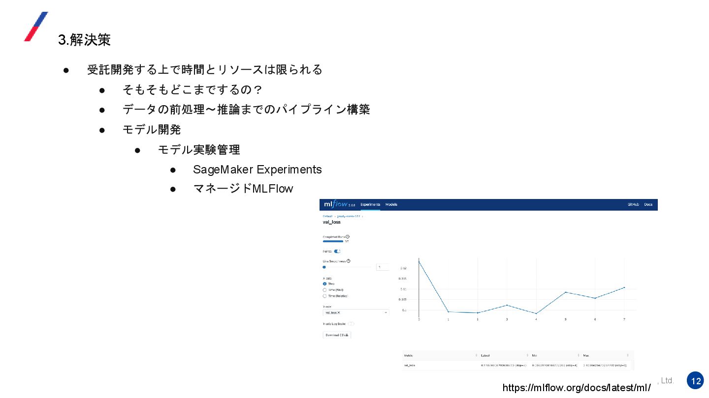 • モデル開発 • モデル実験管理 • SageMaker Experiments • マネージドMLFlow 3.解決策 https://mlflow.org/docs/latest/ml/