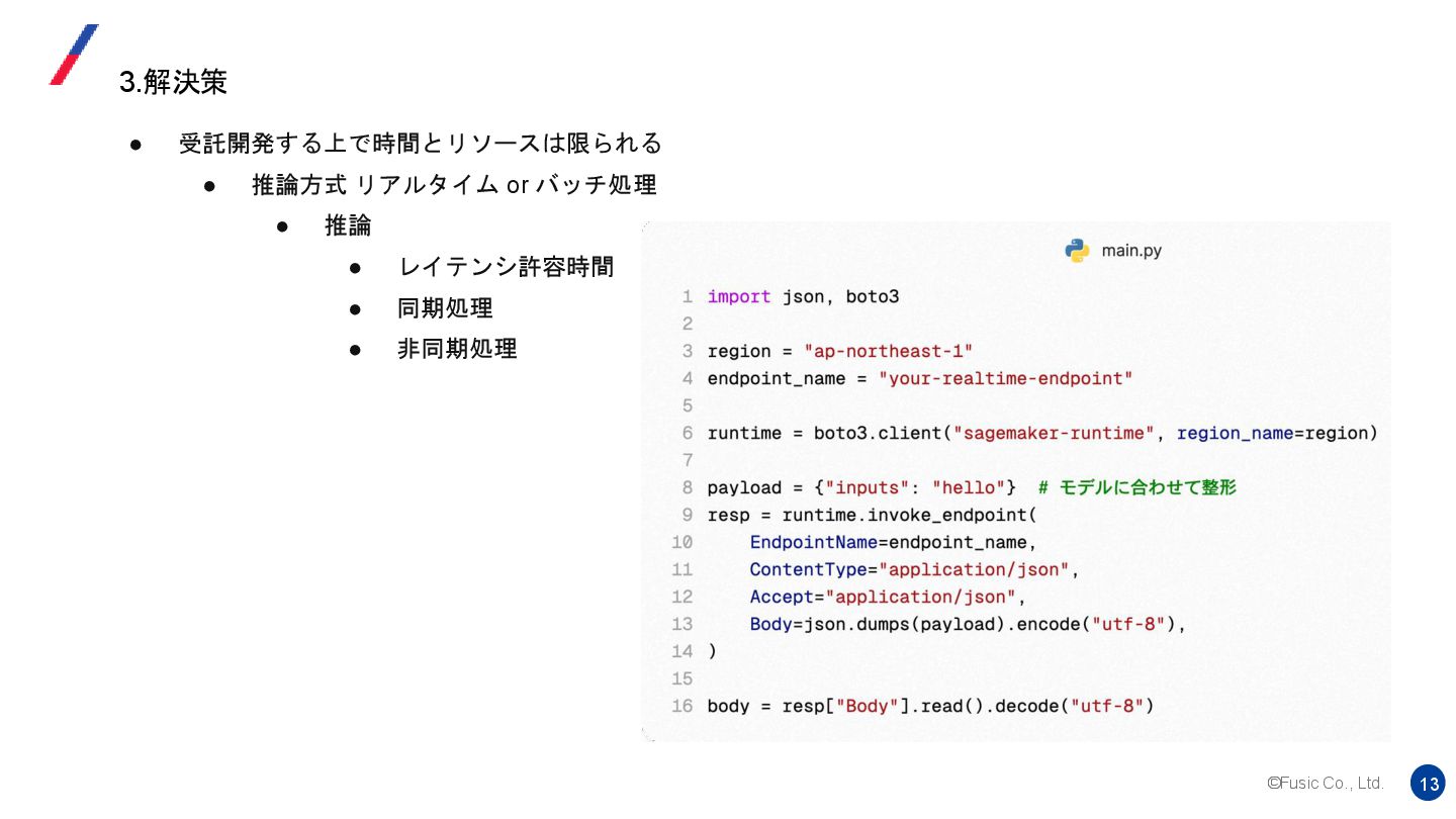 ©Fusic Co., Ltd. 12 • 受託開発する上で時間とリソースは限られる • そもそもどこまでするの? • データの前処理〜推論までのパイプライン構築