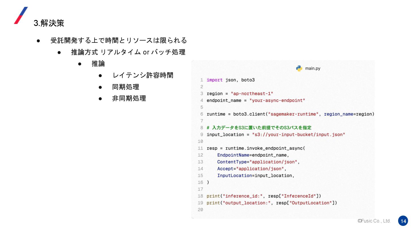バッチ処理 • 推論 • レイテンシ許容時間 • 同期処理 • 非同期処理 3.解決策