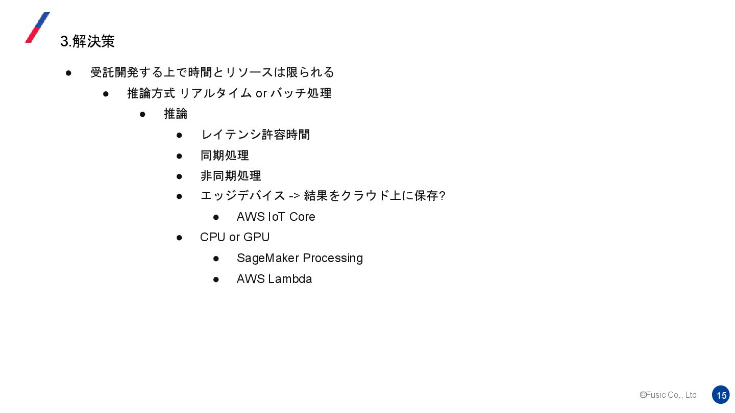 ©Fusic Co., Ltd. 14 • 受託開発する上で時間とリソースは限られる • 推論方式 リアルタイム or