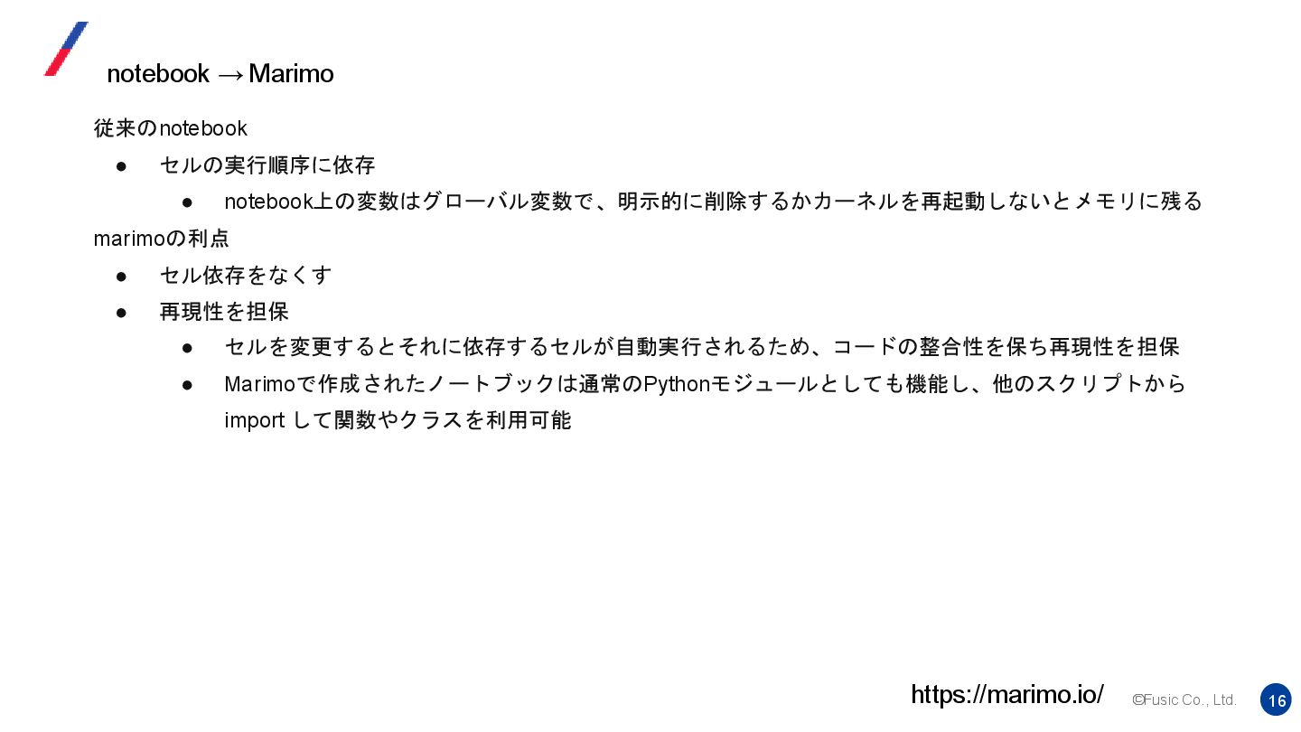 • セル依存をなくす • 再現性を担保 • セルを変更するとそれに依存するセルが自動実行されるため、コードの整合性を保ち再現性を担保 • Marimoで作成されたノートブックは通常のPythonモジュールとしても機能し、他のスクリプトから import して関数やクラスを利用可能 notebook → Marimo https://marimo.io/