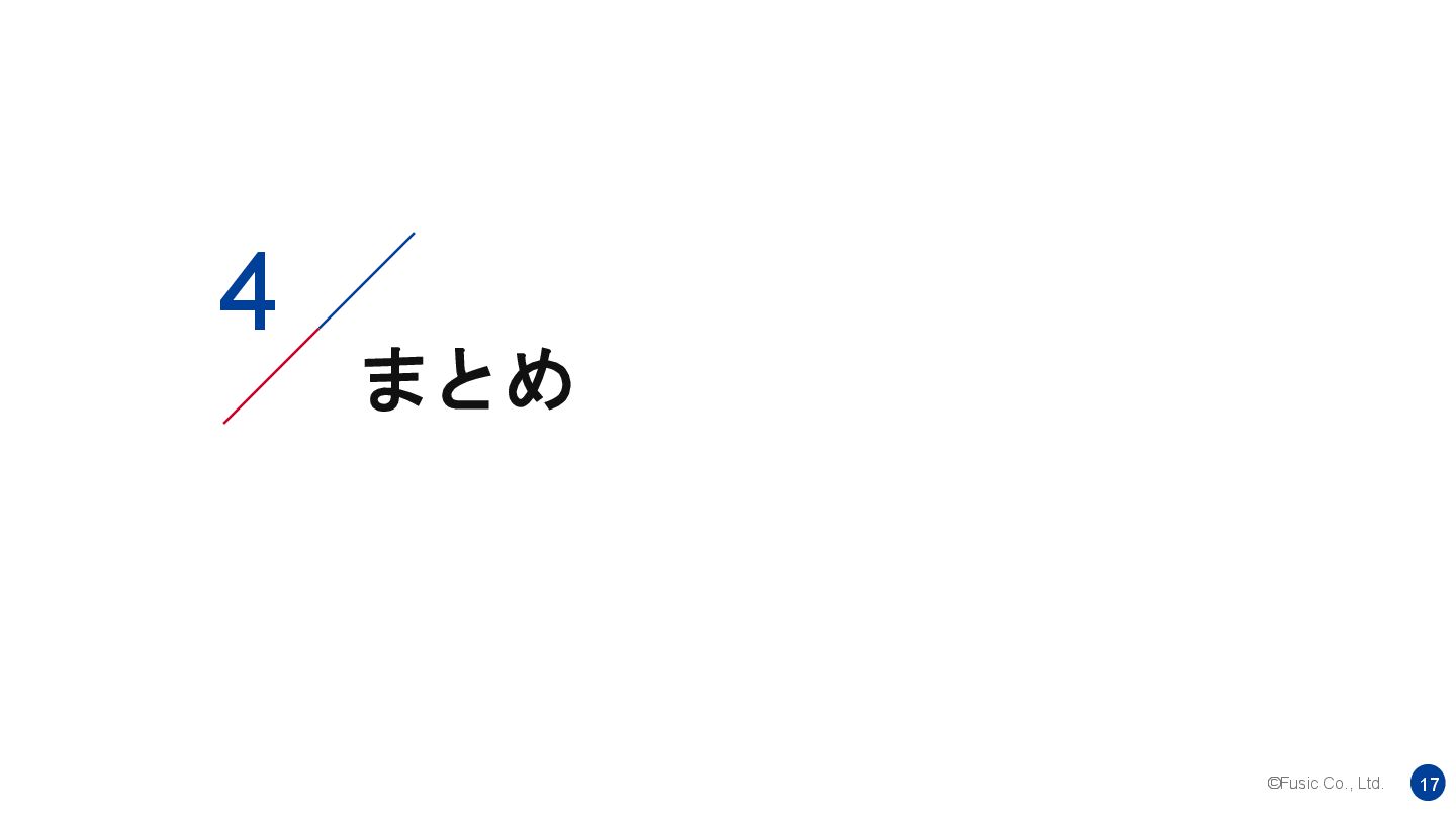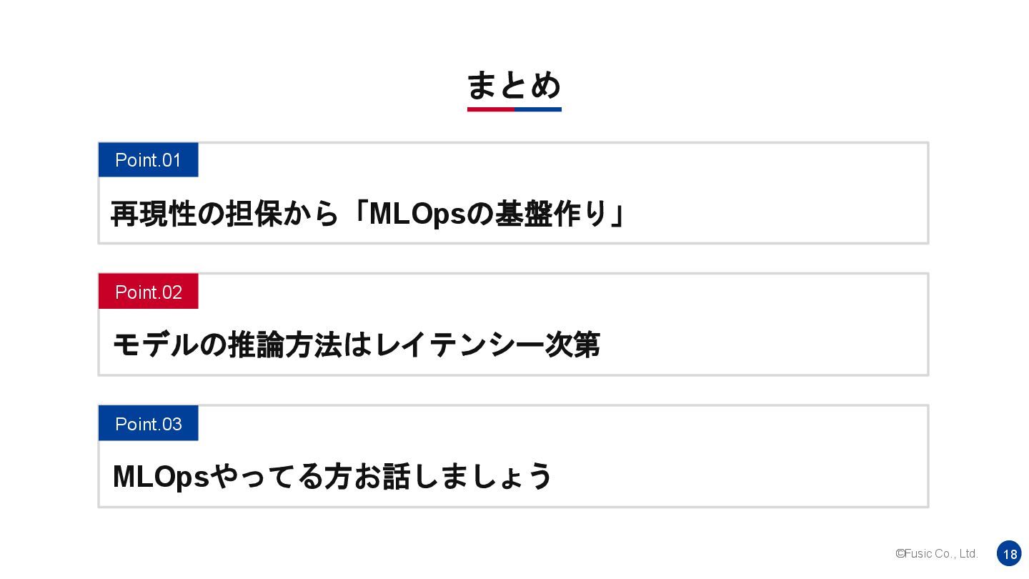 ©Fusic Co., Ltd. 18 まとめ Point.01 Point.02 Point.03 再現性の担保から「MLOpsの基盤作り」 モデルの推論方法はレイテンシー次第