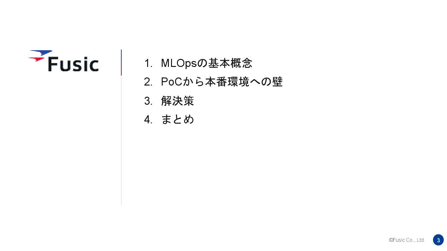 ©Fusic Co., Ltd. 3 1. MLOpsの基本概念 2. PoCから本番環境への壁 3. 解決策