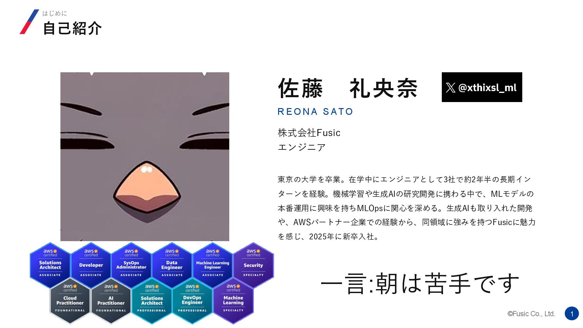O N A S AT O 株式会社Fusic エンジニア 東京の大学を卒業。在学中にエンジニアとして3社で約2年半の長期イン ターンを経験。機械学習や生成AIの研究開発に携わる中で、MLモデルの 本番運用に興味を持ちMLOpsに関心を深める。生成AIも取り入れた開発 や、AWSパートナー企業での経験から、同領域に強みを持つFusicに魅力 を感じ、2025年に新卒入社。 一言:朝は苦手です