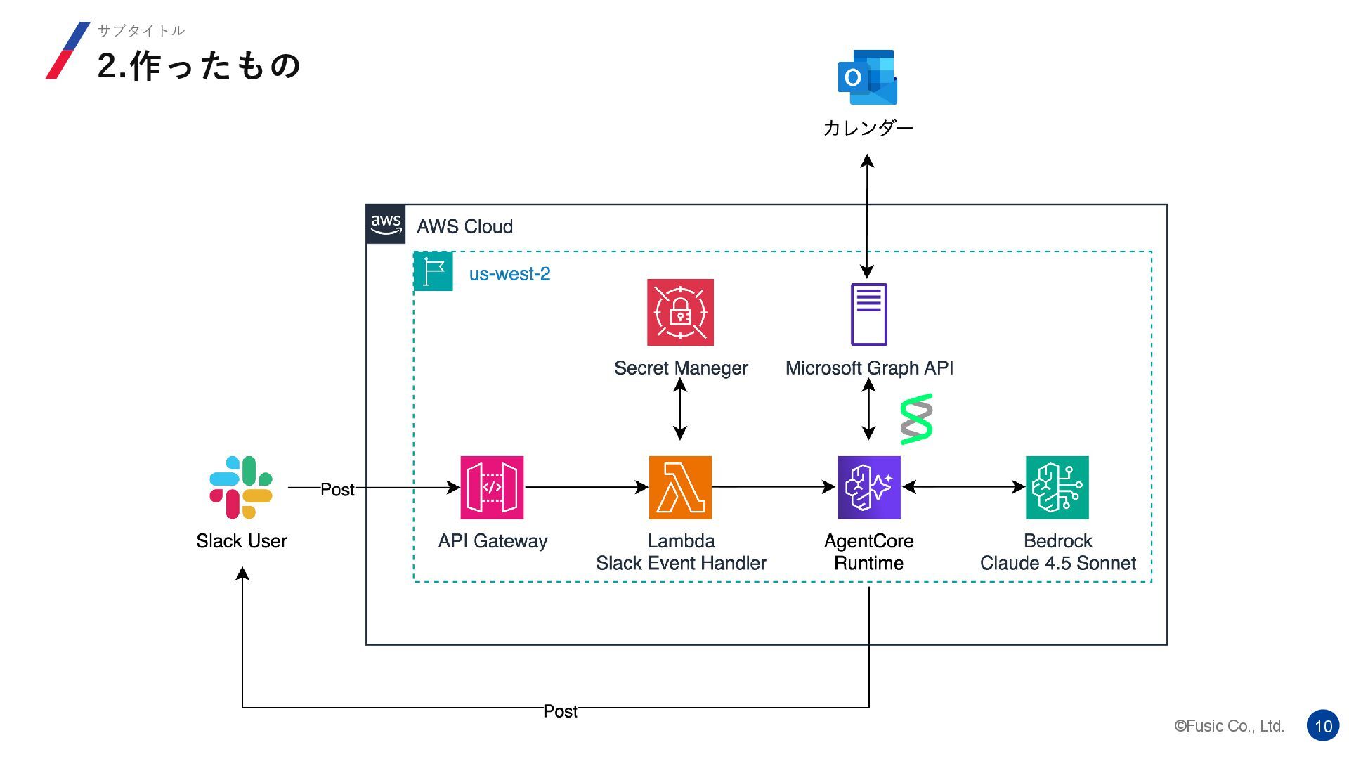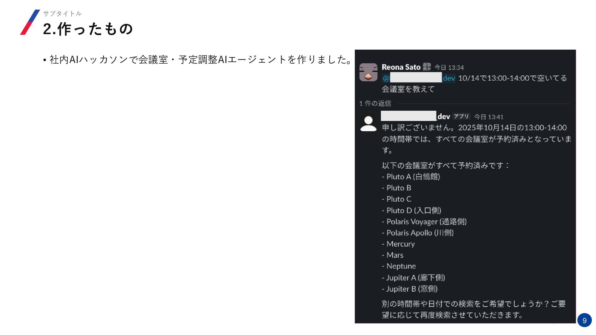 ©Fusic Co., Ltd. 9 2.作ったもの サブタイトル • 社内AIハッカソンで会議室・予定調整AIエージェントを作りました。