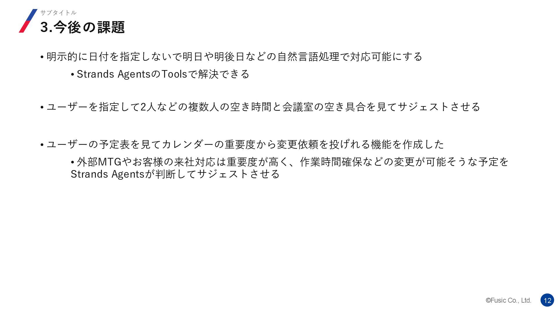 ©Fusic Co., Ltd. 12 3.今後の課題 サブタイトル • 明示的に日付を指定しないで明日や明後日などの自然言語処理で対応可能にする • Strands