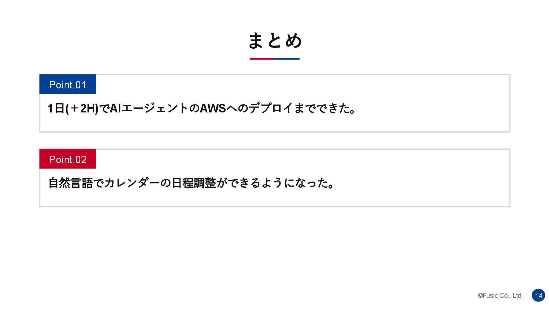 ©Fusic Co., Ltd. 14 まとめ 1日(+2H)でAIエージェントのAWSへのデプロイまでできた。 自然言語でカレンダーの日程調整ができるようになった。 Point.01 Point.02