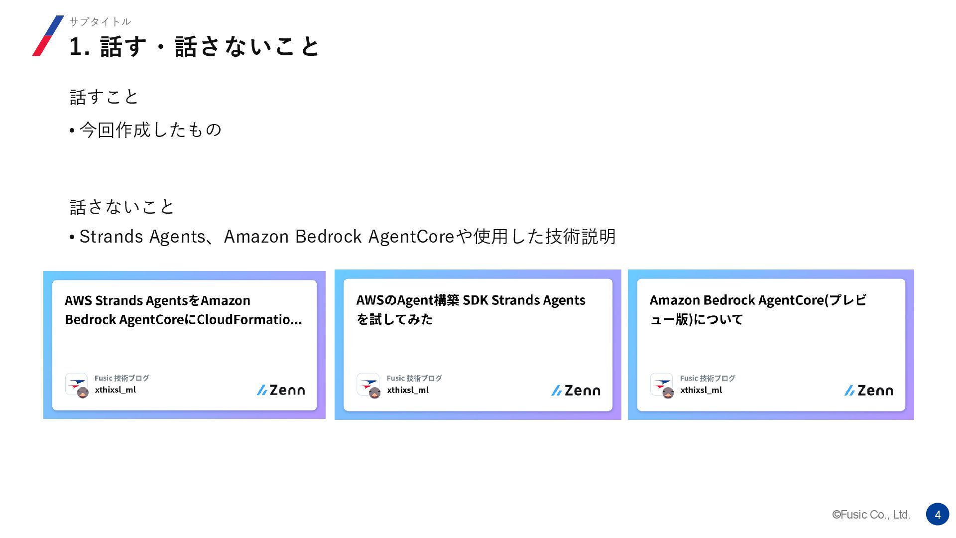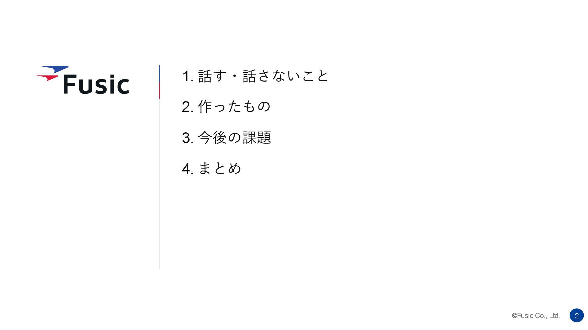 ©Fusic Co., Ltd. 2 1. 話す・話さないこと 2. 作ったもの 3. 今後の課題