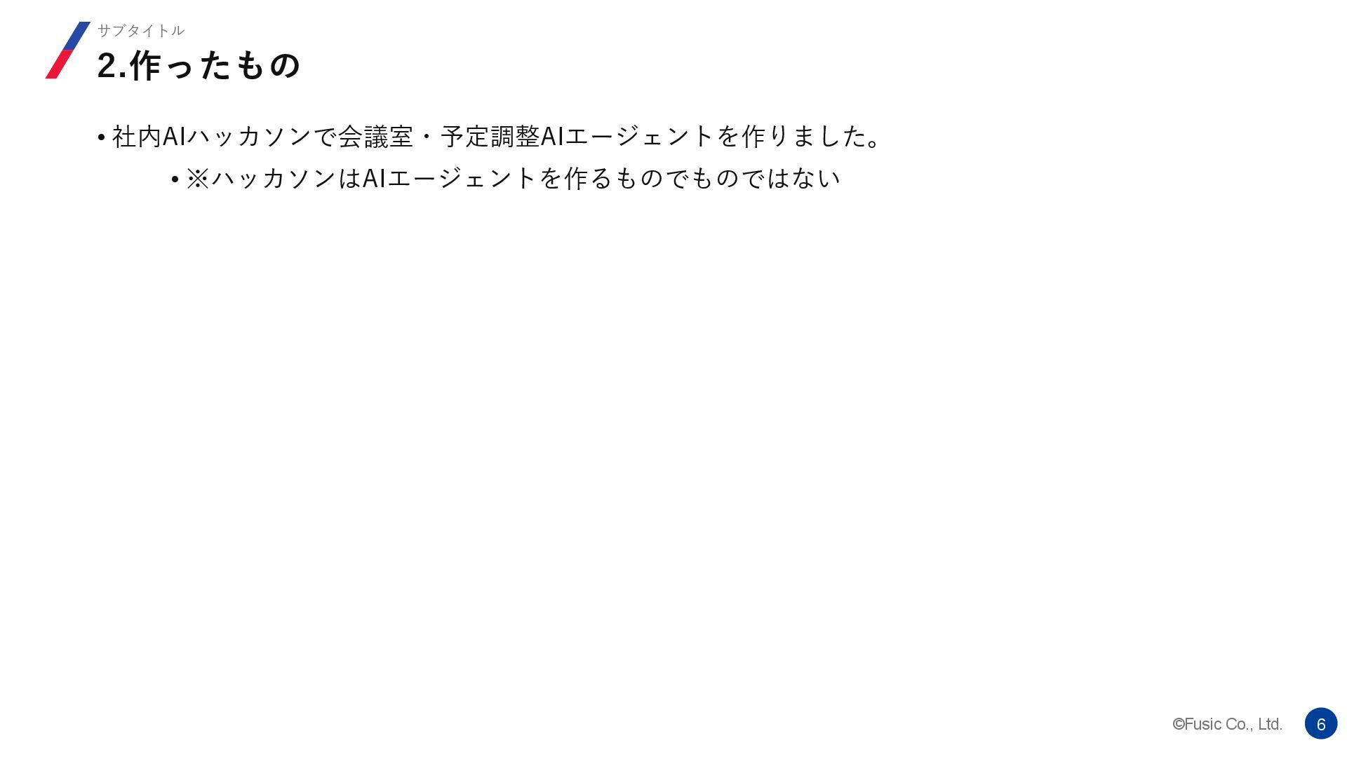 ©Fusic Co., Ltd. 6 2.作ったもの サブタイトル • 社内AIハッカソンで会議室・予定調整AIエージェントを作りました。 • ※ハッカソンはAIエージェントを作るものでものではない