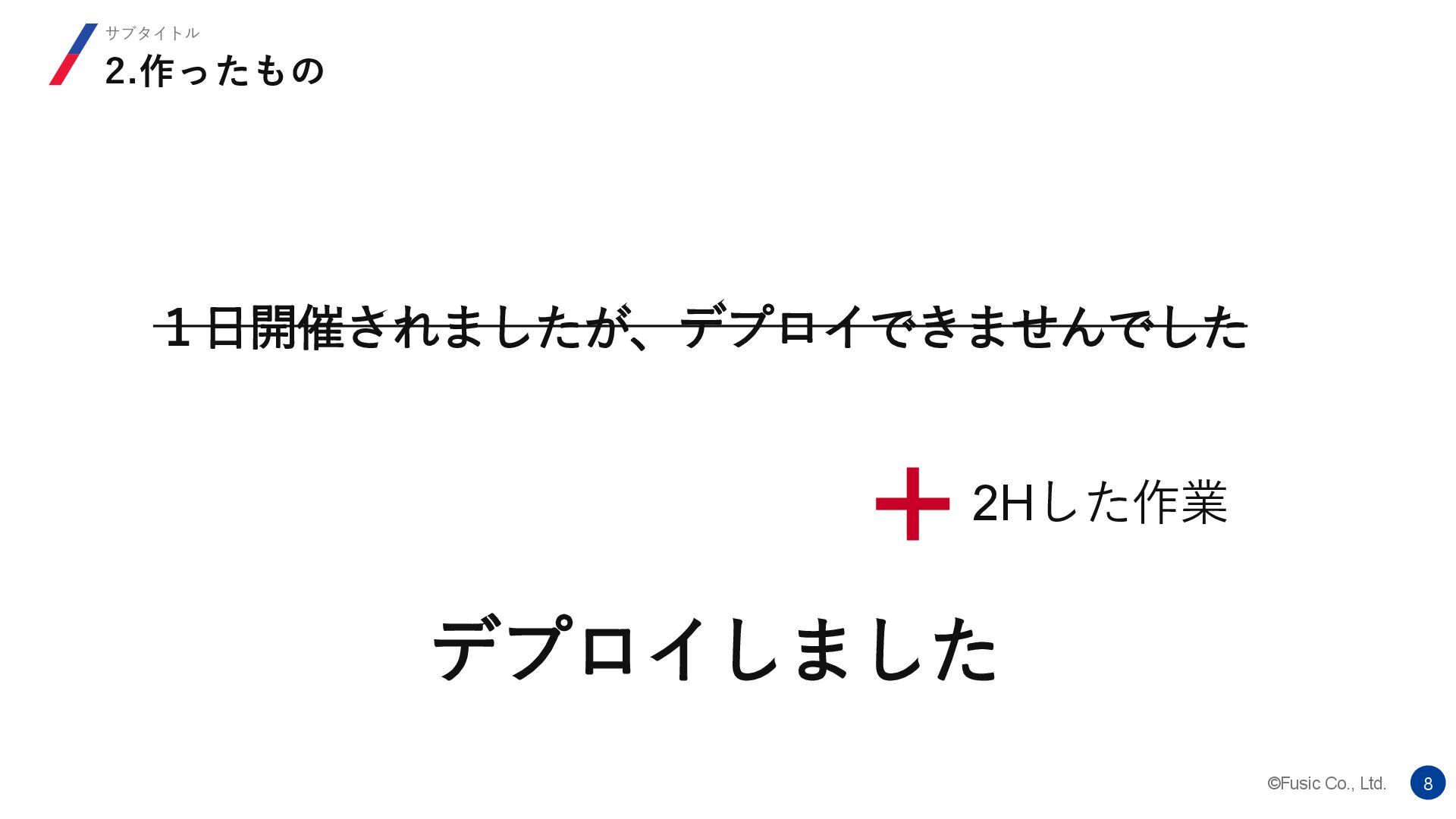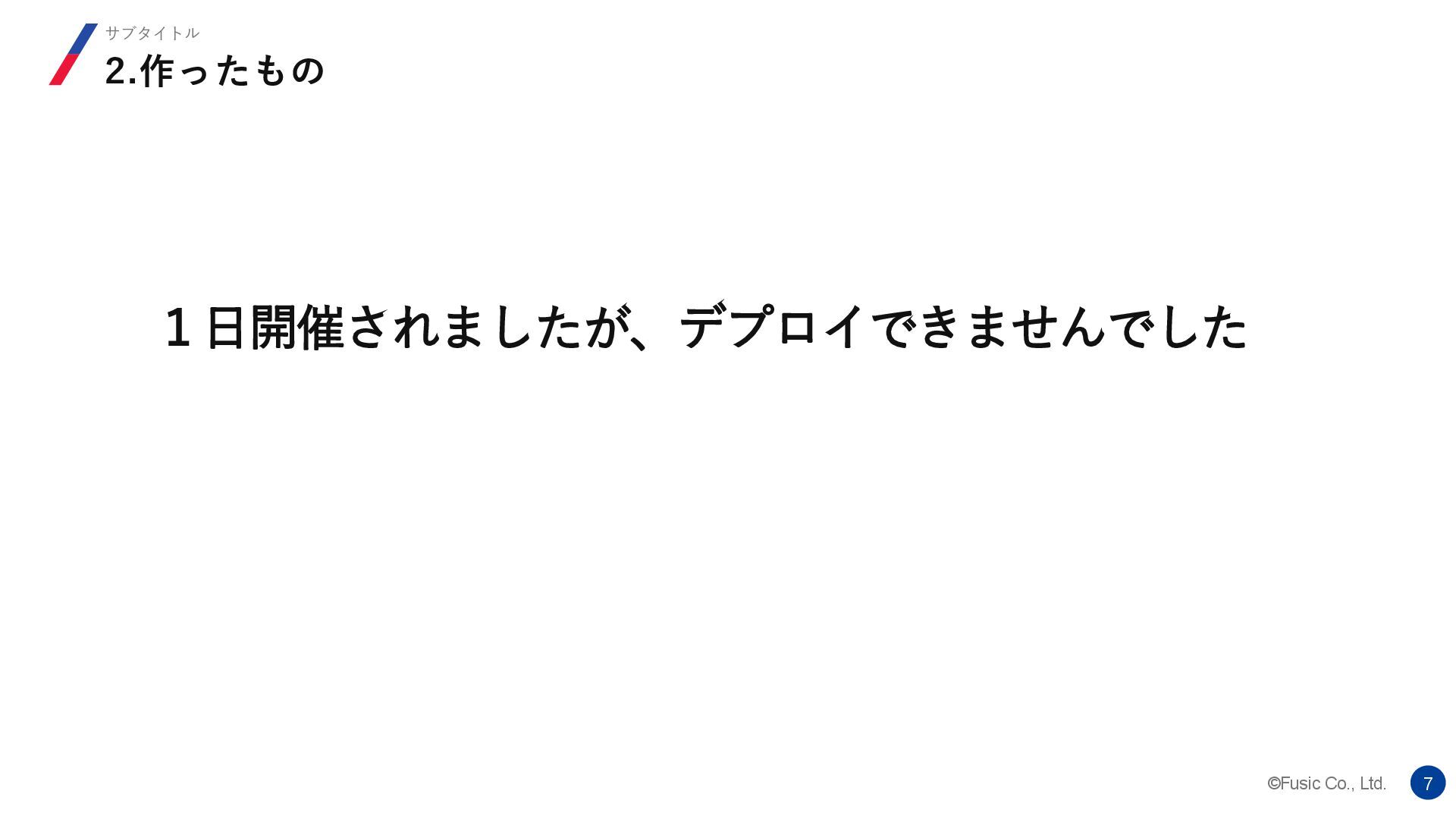 ©Fusic Co., Ltd. 7 2.作ったもの サブタイトル 1日開催されましたが、デプロイできませんでした
