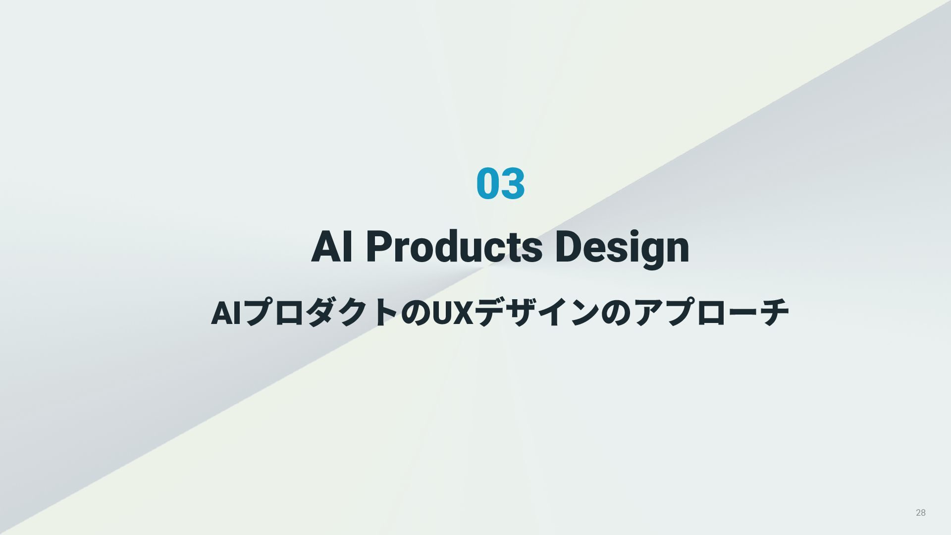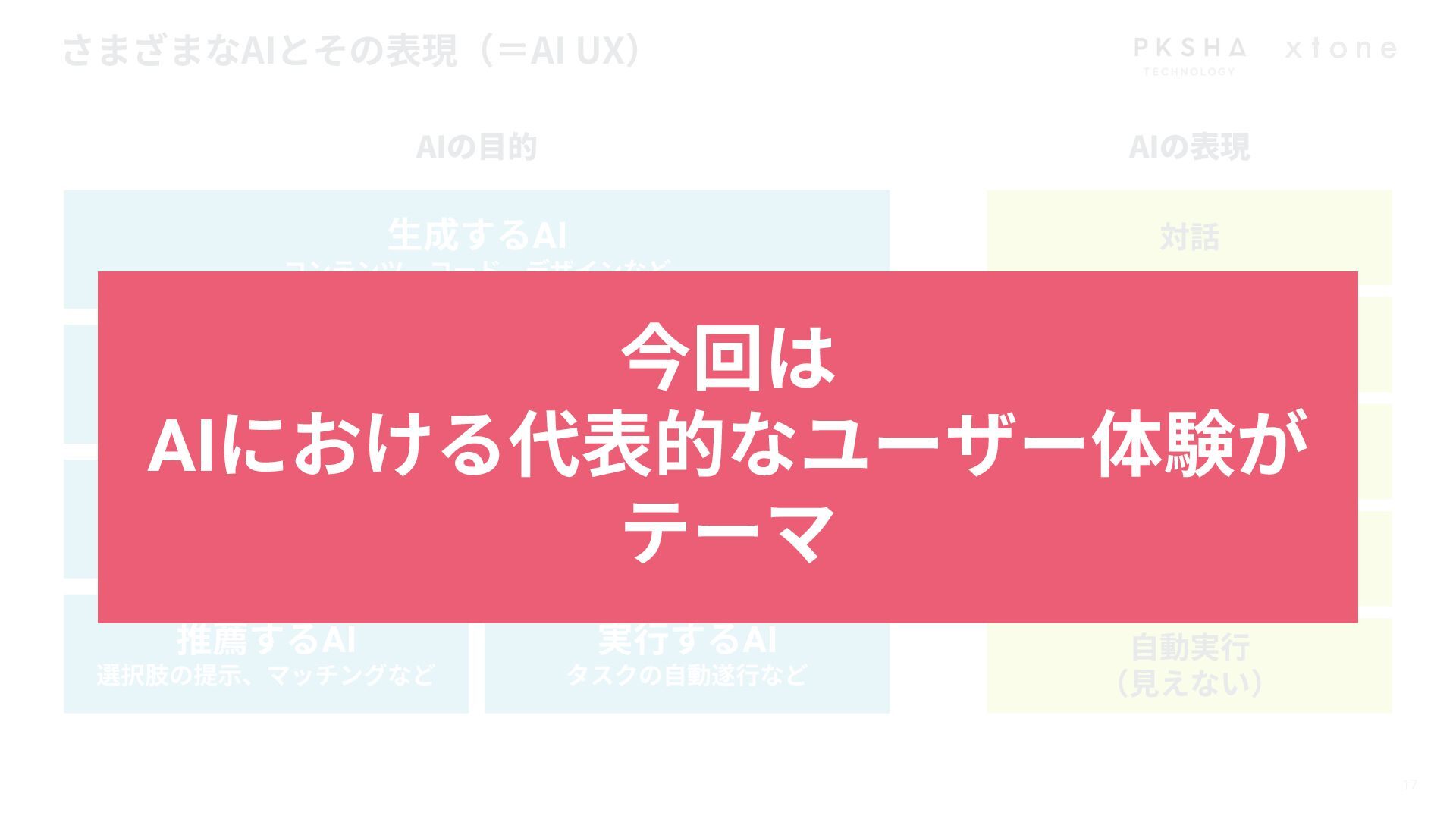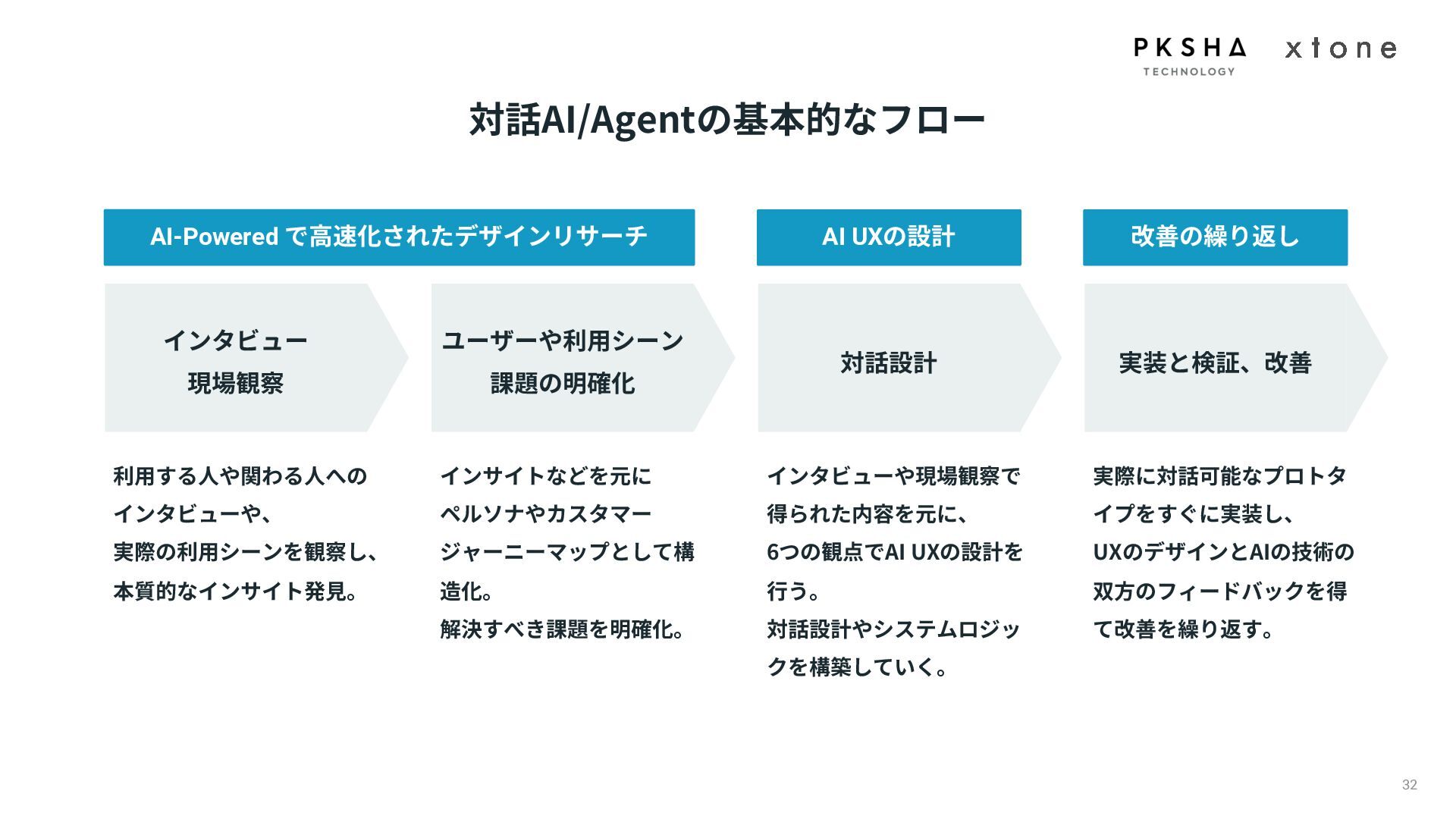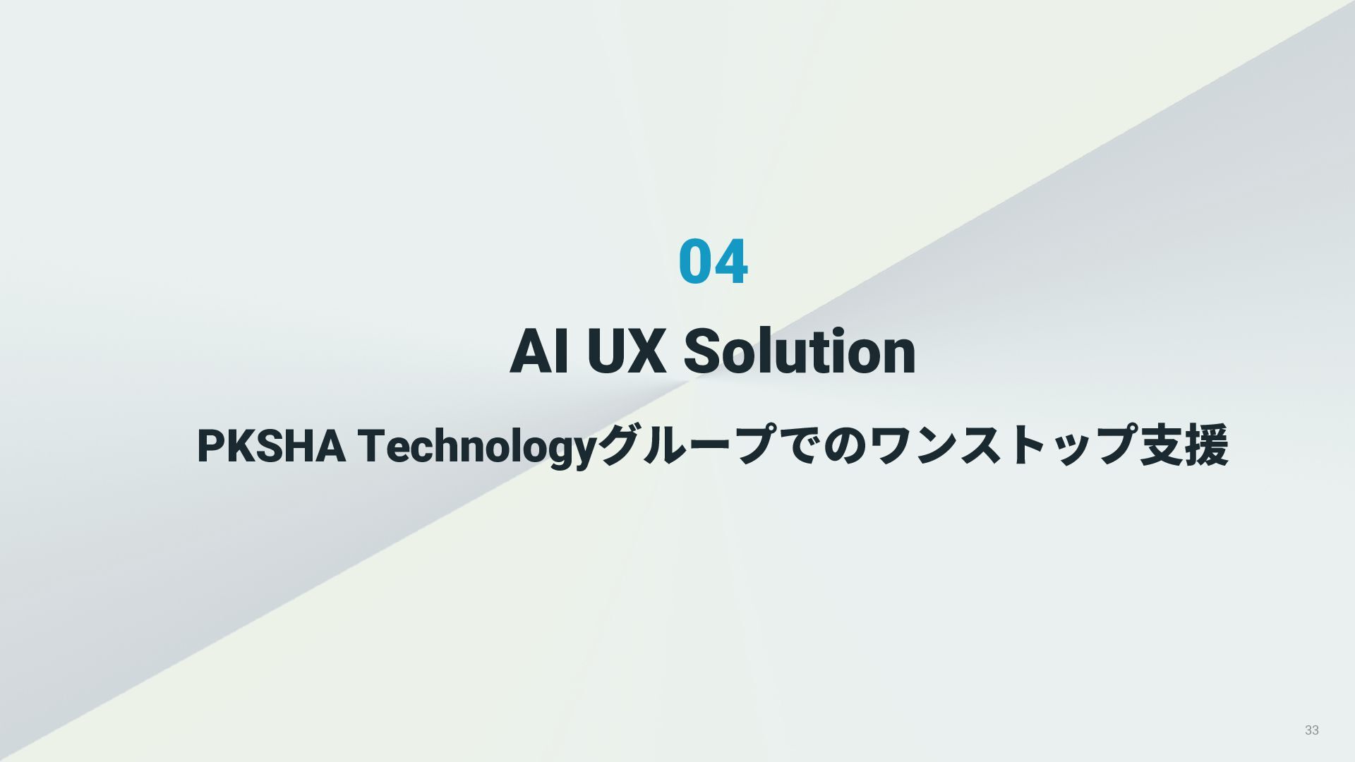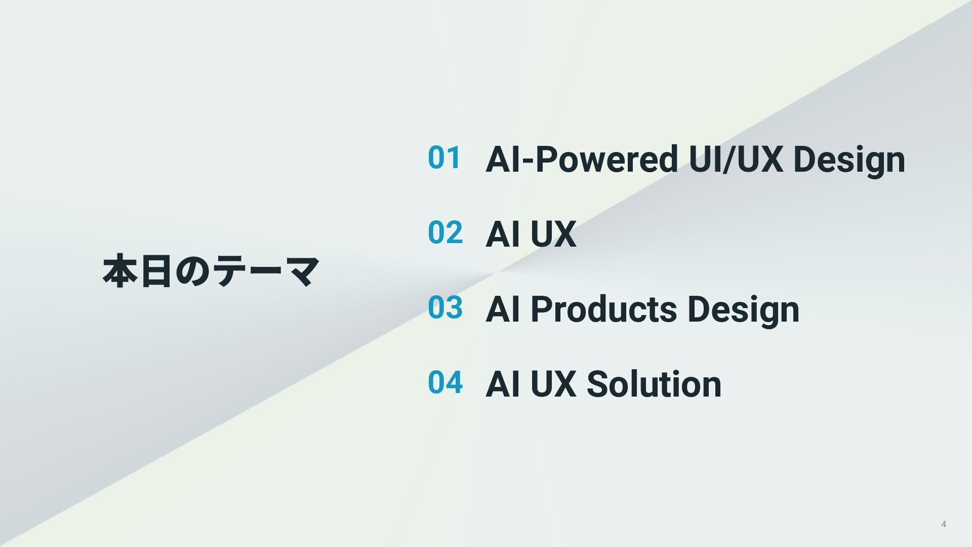 01. UI/UXデザインの現場におけるAI活用の現状 02. AI時代におけるUXデザイン変化 03. AIプロダクトのUXデザインのアプローチ 04. PKSHA Technologyグループでのワンストップ支援