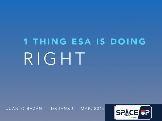 Slides for the Ignite talk at the SpaceUp Cologne held in the European Astronaut Center of the European Space Agency in March 2015. slides are not very useful without the video: www.youtube.com/watch?v=a6-rqQKlhNw