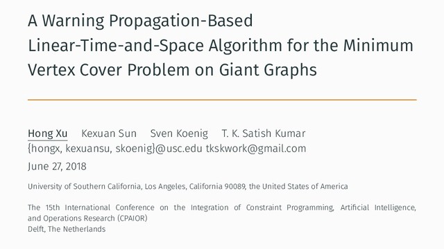 MVC-WP-SF 0025871-session-1-bg 688,391 695,636 701,228 698,818 699,234 694,616 694,625 0025872-session-2-bg 706,691 714,407 720,128 717,692 718,017 713,557 713,599 0025869-session-1-bg 629,715 637,159 642,647 640,327 641,147 636,057 636,050 0025876-session-1-bg 712,322 721,476 728,763 725,679 726,560 720,332 720,404 0025865-session-2-bg 656,483 663,359 669,205 666,846 666,996 662,446 662,564 0025868-session-1-bg 662,749 670,415 676,703 674,029 674,729 669,473 669,452 0025872-session-1-bg 692,476 700,076 705,979 703,495 704,039 699,263 699,284 0025864-session-2-bg 631,361 638,668 644,392 641,875 642,737 637,833 637,831 0025912-session-2 716,154 724,000 730,201 727,577 727,982 723,070 723,165 0025868-session-2-bg 662,025 669,661 676,133 673,415 673,972 668,845 668,784 0025869-session-2-bg 651,656 659,116 665,348 662,796 662,931 658,201 658,171 0025873-session-1-bg 595,166 601,378 605,916 604,042 604,270 600,488 600,467 0025870-session-2-bg 735,348 744,205 751,736 748,478 749,706 743,052 743,103 0025865-session-1-bg 676,416 683,459 689,108 686,788 687,193 682,528 682,526 0025889-session-2 674,887 683,034 689,378 686,679 687,462 682,117 682,056 0025876-session-2-bg 701,544 710,627 717,965 714,784 715,793 709,579 709,604 0025867-session-1-bg 682,118 689,846 695,806 693,294 693,749 688,861 688,829 0025874-session-2-bg 701,559 709,752 716,330 713,553 714,320 708,796 708,786 0025873-session-2-bg 635,363 641,971 647,566 645,325 645,449 641,349 641,441 0025889-session-1 644,858 651,812 657,483 655,226 655,525 651,102 651,113 0025870-session-1-bg 721,906 730,773 738,123 734,922 736,193 729,761 729,805 0025871-session-2-bg 674,478 681,551 687,309 684,955 685,328 680,690 680,686 0025864-session-1-bg 634,702 642,146 647,884 645,431 646,130 641,119 641,058 0025867-session-2-bg 673,075 680,577 686,239 683,853 684,641 679,654 679,647 0025878-session-1-bg 636,617 644,044 650,351 647,661 648,109 643,237 643,190 0025886-session-1 713,597 721,617 728,101 725,332 726,009 720,641 720,638 Xu et al. (University of Southern California) A Warning Propagation-Based Linear-Time-and-Space Algorithm for the MVC Problem 21 / 25