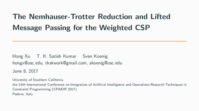 The presentation slides of the paper "Hong Xu, T. K. Satish Kumar, and Sven Koenig. The Nemhauser-Trotter reduction and lifted message passing for the weighted CSP. In the 14th International Conference on Integration of Artificial Intelligence and Operations Research Techniques in Constraint Programming (CPAIOR), 387–402. 2017. doi:10.1007/978-3-319-59776-8_31."