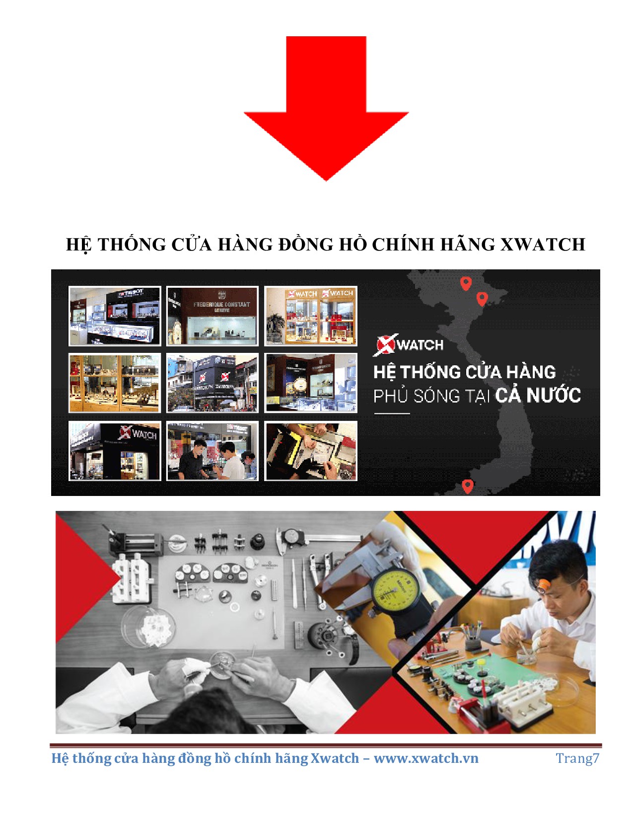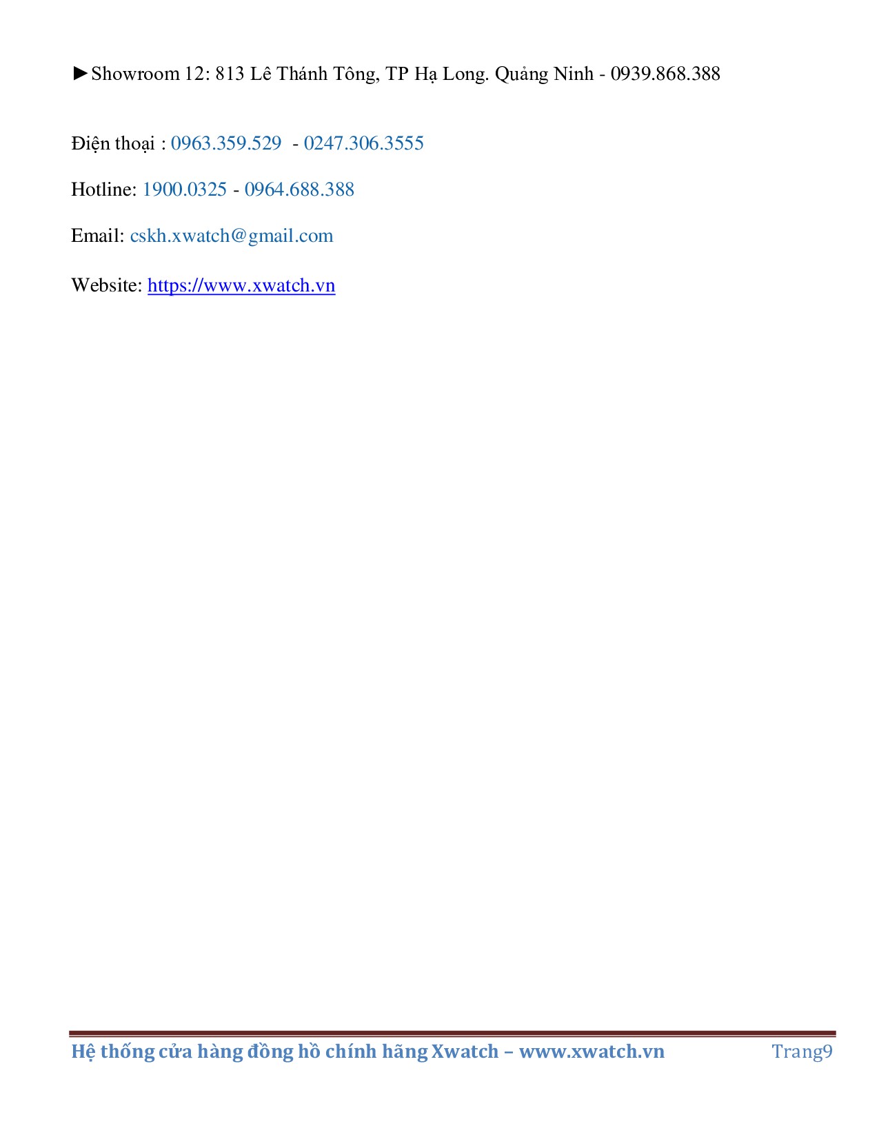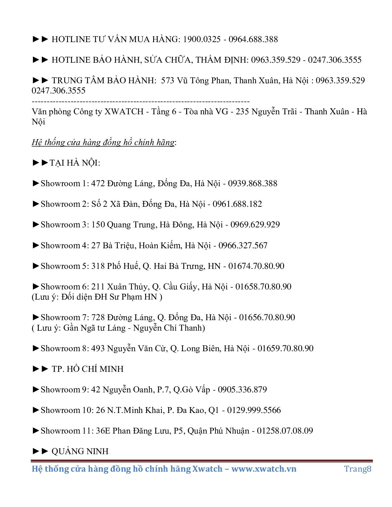 www.xwatch.vn Trang8 ►► HOTLINE TƯ VẤN MUA HÀNG: 1900.0325 - 0964.688.388 ►► HOTLINE BẢO HÀNH, SỬA CHỮA, THẨM ĐỊNH: 0963.359.529 - 0247.306.3555 ►► TRUNG TÂM BẢO HÀNH: 573 Vũ Tông Phan, Thanh Xuân, Hà Nội : 0963.359.529 0247.306.3555 ------------------------------------------------------------------------- Văn phòng Công ty XWATCH - Tầng 6 - Tòa nhà VG - 235 Nguyễn Trãi - Thanh Xuân - Hà Nội Hệ thống cửa hàng đồng hồ chính hãng: ►►TẠI HÀ NỘI: ►Showroom 1: 472 Đường Láng, Đống Đa, Hà Nội - 0939.868.388 ►Showroom 2: Số 2 Xã Đàn, Đống Đa, Hà Nội - 0961.688.182 ►Showroom 3: 150 Quang Trung, Hà Đông, Hà Nội - 0969.629.929 ►Showroom 4: 27 Bà Triệu, Hoàn Kiếm, Hà Nội - 0966.327.567 ►Showroom 5: 318 Phố Huế, Q. Hai Bà Trưng, HN - 01674.70.80.90 ►Showroom 6: 211 Xuân Thủy, Q. Cầu Giấy, Hà Nội - 01658.70.80.90 (Lưu ý: Đối diện ĐH Sư Phạm HN ) ►Showroom 7: 728 Đường Láng, Q. Đống Đa, Hà Nội - 01656.70.80.90 ( Lưu ý: Gần Ngã tư Láng - Nguyễn Chí Thanh) ►Showroom 8: 493 Nguyễn Văn Cừ, Q. Long Biên, Hà Nội - 01659.70.80.90 ►► TP. HỒ CHÍ MINH ►Showroom 9: 42 Nguyễn Oanh, P.7, Q.Gò Vấp - 0905.336.879 ►Showroom 10: 26 N.T.Minh Khai, P. Đa Kao, Q1 - 0129.999.5566 ►Showroom 11: 36E Phan Đăng Lưu, P5, Quận Phú Nhuận - 01258.07.08.09 ►► QUẢNG NINH