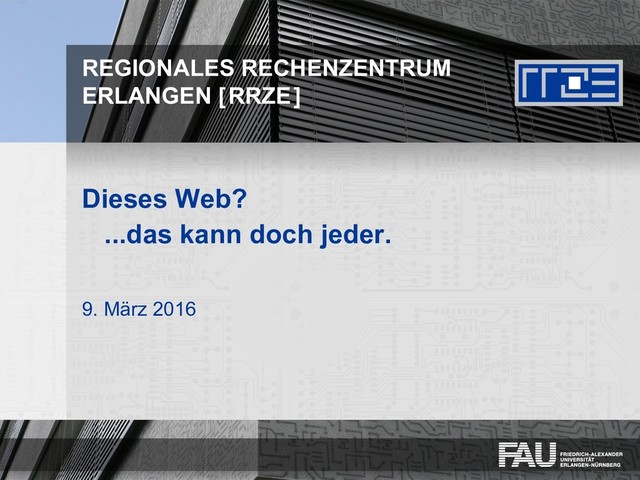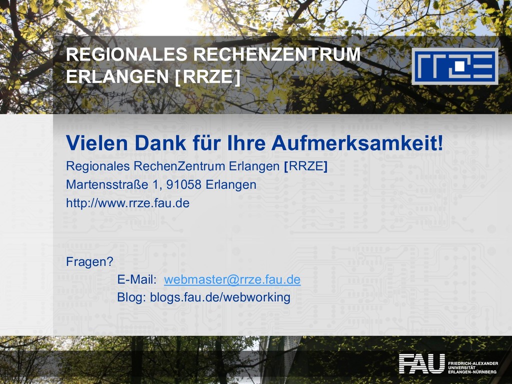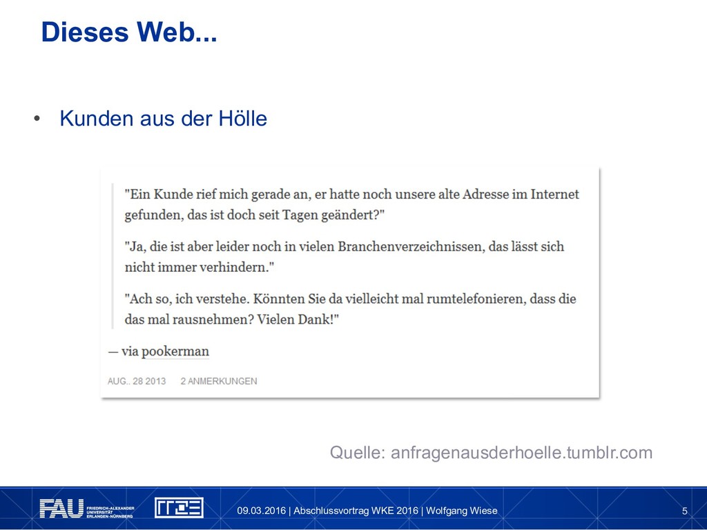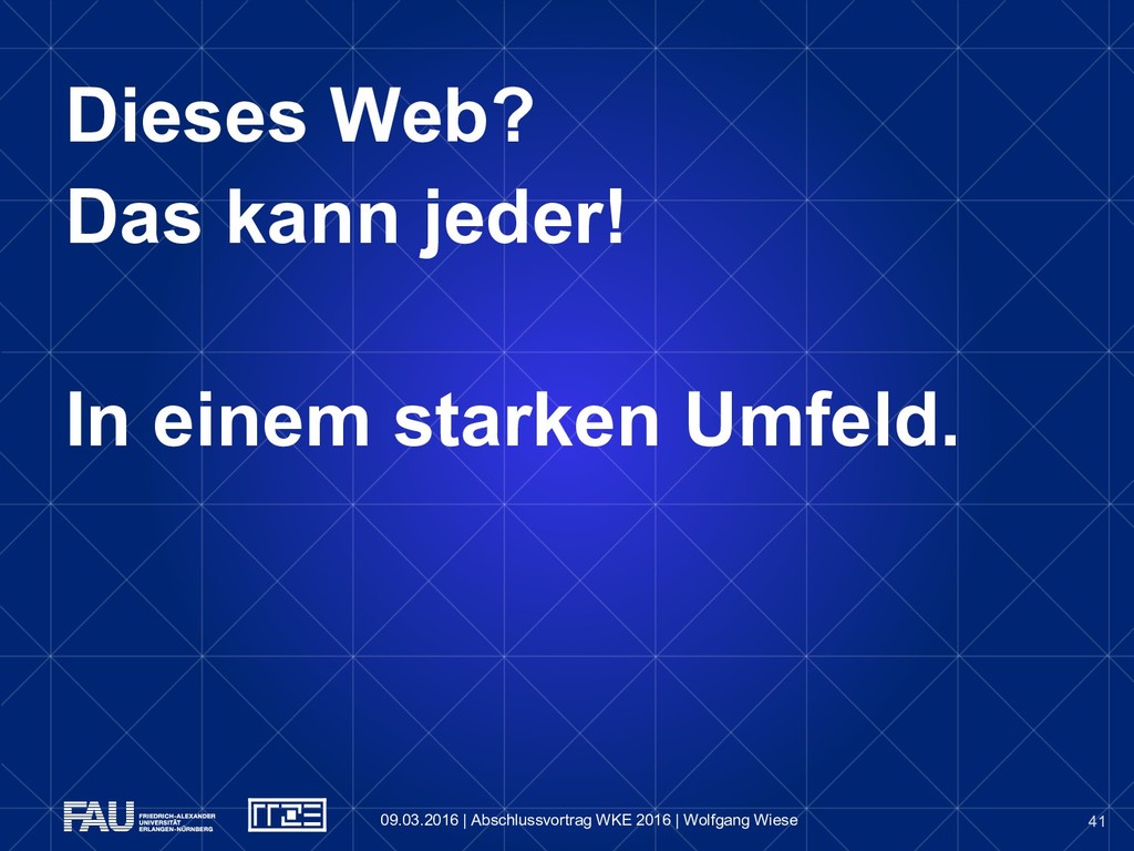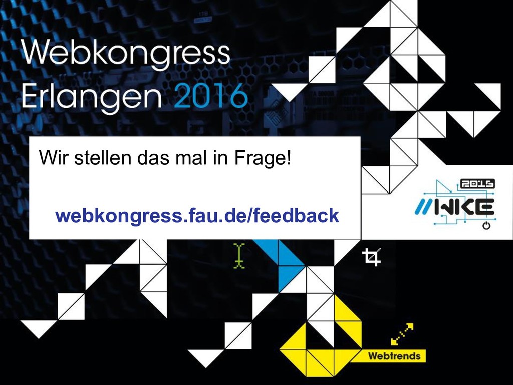 und gelassen. Ein Webauftritt „lebt“ und wird nie fertig und nie perfekt sein. Fazit? 09.03.2016 | Abschlussvortrag WKE 2016 | Wolfgang Wiese Wir stellen das mal in Frage! webkongress.fau.de/feedback