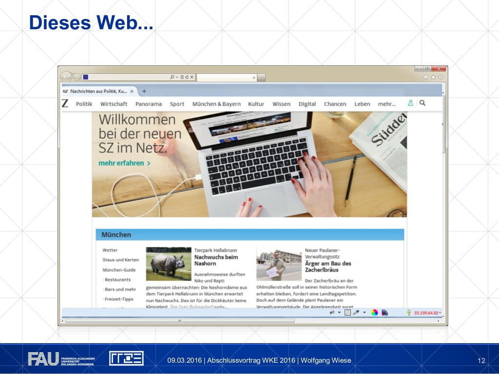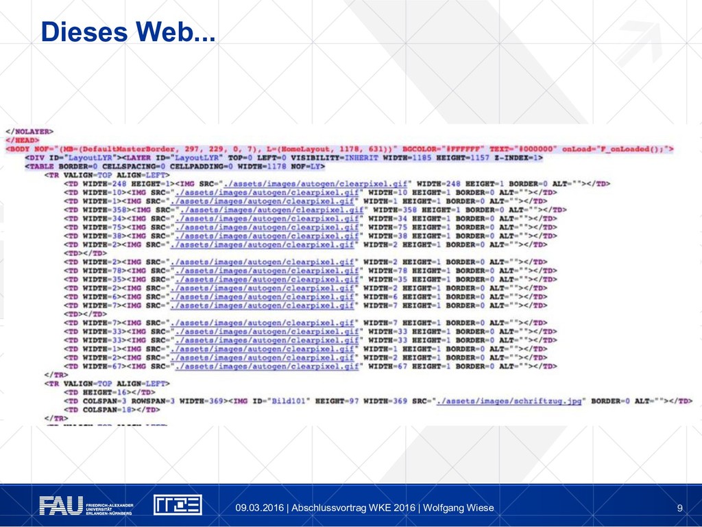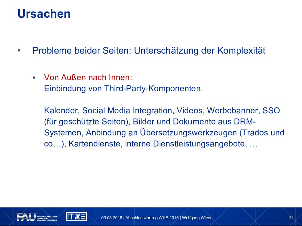 Außen nach Innen: Einbindung von Third-Party-Komponenten. Kalender, Social Media Integration, Videos, Werbebanner, SSO (für geschützte Seiten), Bilder und Dokumente aus DRM- Systemen, Anbindung an Übersetzungswerkzeugen (Trados und co…), Kartendienste, interne Dienstleistungsangebote, … Ursachen 09.03.2016 | Abschlussvortrag WKE 2016 | Wolfgang Wiese