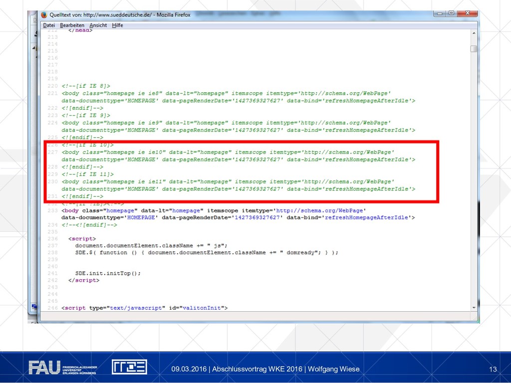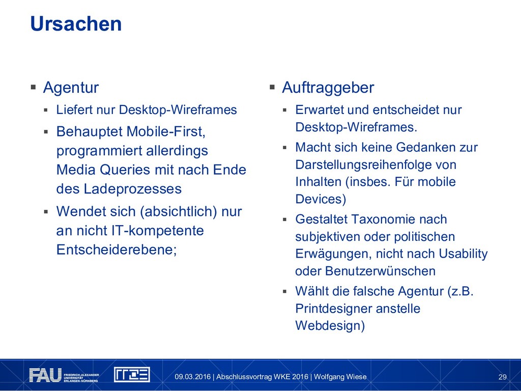 programmiert allerdings Media Queries mit nach Ende des Ladeprozesses § Wendet sich (absichtlich) nur an nicht IT-kompetente Entscheiderebene; Ursachen § Auftraggeber § Erwartet und entscheidet nur Desktop-Wireframes. § Macht sich keine Gedanken zur Darstellungsreihenfolge von Inhalten (insbes. Für mobile Devices) § Gestaltet Taxonomie nach subjektiven oder politischen Erwägungen, nicht nach Usability oder Benutzerwünschen § Wählt die falsche Agentur (z.B. Printdesigner anstelle Webdesign) 09.03.2016 | Abschlussvortrag WKE 2016 | Wolfgang Wiese