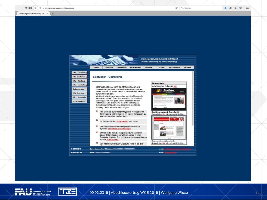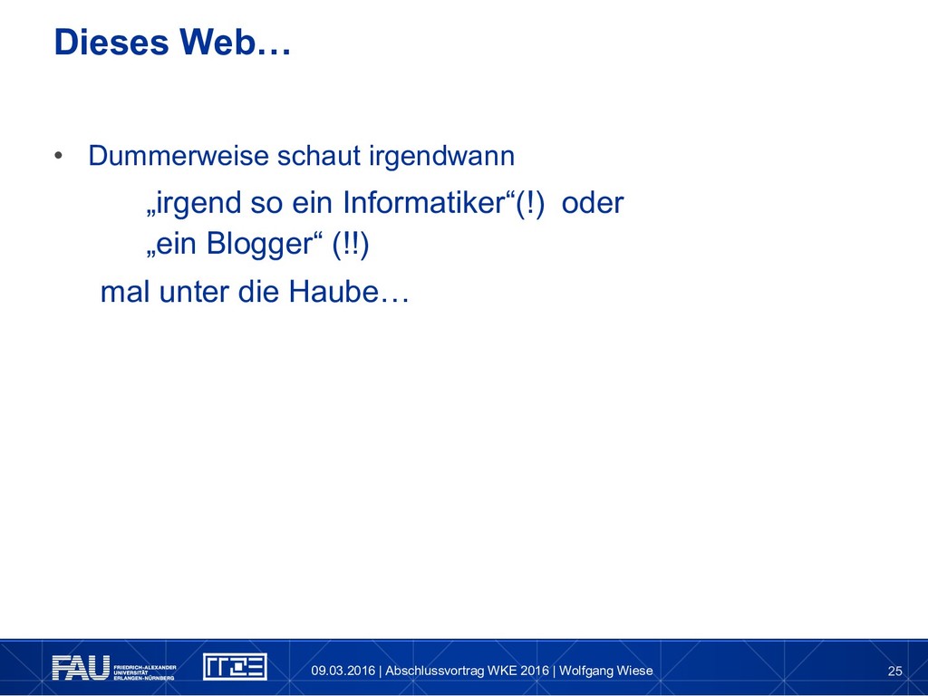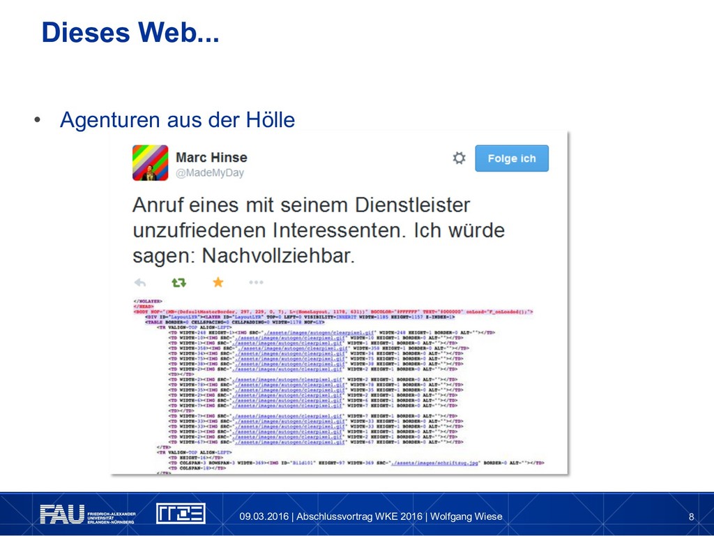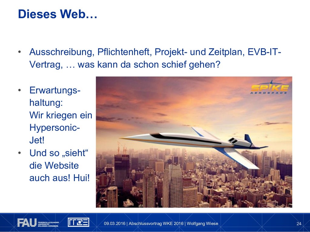 was kann da schon schief gehen? • Erwartungs- haltung: Wir kriegen ein Hypersonic- Jet! • Und so „sieht“ die Website auch aus! Hui! Dieses Web… 09.03.2016 | Abschlussvortrag WKE 2016 | Wolfgang Wiese