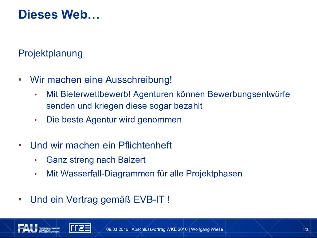 Agenturen können Bewerbungsentwürfe senden und kriegen diese sogar bezahlt • Die beste Agentur wird genommen • Und wir machen ein Pflichtenheft • Ganz streng nach Balzert • Mit Wasserfall-Diagrammen für alle Projektphasen • Und ein Vertrag gemäß EVB-IT ! Dieses Web… 09.03.2016 | Abschlussvortrag WKE 2016 | Wolfgang Wiese