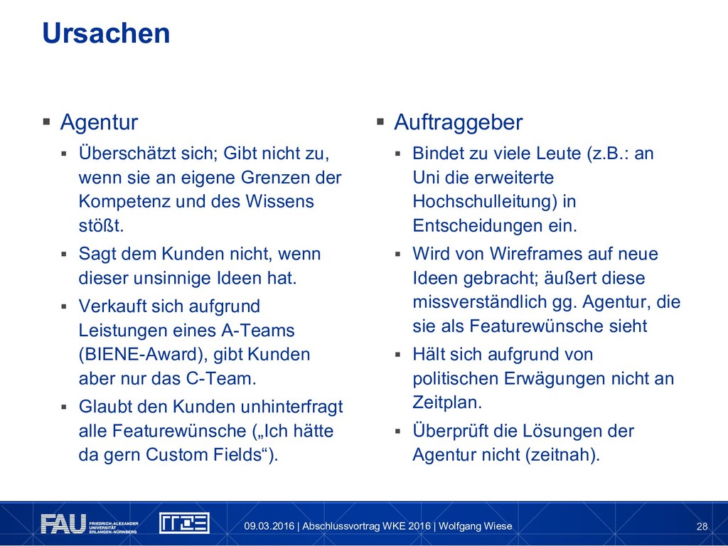 sie an eigene Grenzen der Kompetenz und des Wissens stößt. § Sagt dem Kunden nicht, wenn dieser unsinnige Ideen hat. § Verkauft sich aufgrund Leistungen eines A-Teams (BIENE-Award), gibt Kunden aber nur das C-Team. § Glaubt den Kunden unhinterfragt alle Featurewünsche („Ich hätte da gern Custom Fields“). Ursachen § Auftraggeber § Bindet zu viele Leute (z.B.: an Uni die erweiterte Hochschulleitung) in Entscheidungen ein. § Wird von Wireframes auf neue Ideen gebracht; äußert diese missverständlich gg. Agentur, die sie als Featurewünsche sieht § Hält sich aufgrund von politischen Erwägungen nicht an Zeitplan. § Überprüft die Lösungen der Agentur nicht (zeitnah). 09.03.2016 | Abschlussvortrag WKE 2016 | Wolfgang Wiese
