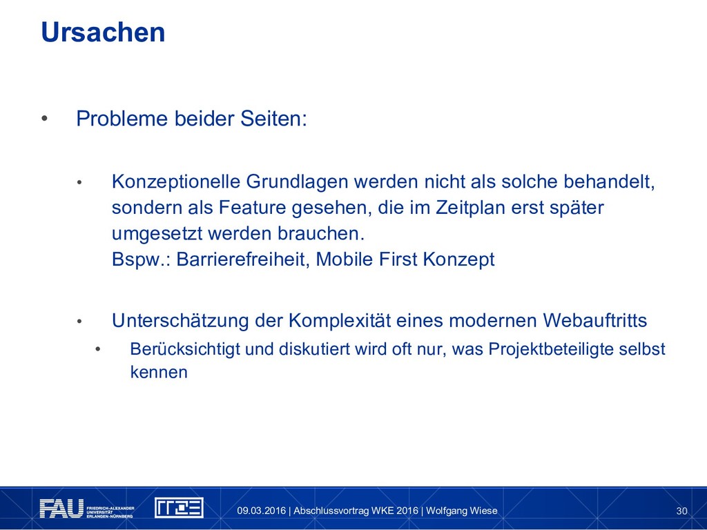 als solche behandelt, sondern als Feature gesehen, die im Zeitplan erst später umgesetzt werden brauchen. Bspw.: Barrierefreiheit, Mobile First Konzept • Unterschätzung der Komplexität eines modernen Webauftritts • Berücksichtigt und diskutiert wird oft nur, was Projektbeteiligte selbst kennen Ursachen 09.03.2016 | Abschlussvortrag WKE 2016 | Wolfgang Wiese