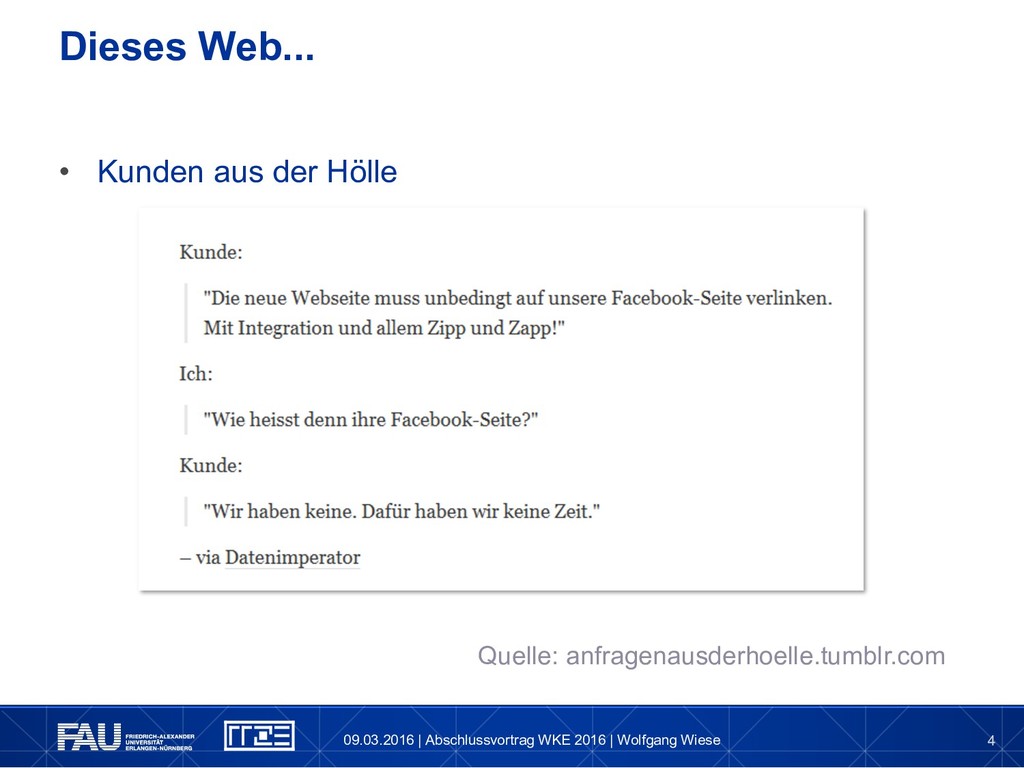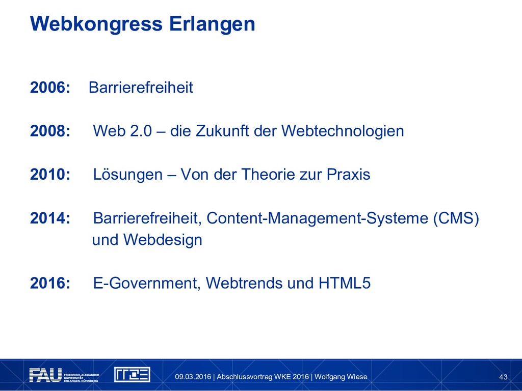 Webtechnologien 2010: Lösungen – Von der Theorie zur Praxis 2014: Barrierefreiheit, Content-Management-Systeme (CMS) und Webdesign 2016: E-Government, Webtrends und HTML5 Webkongress Erlangen 09.03.2016 | Abschlussvortrag WKE 2016 | Wolfgang Wiese