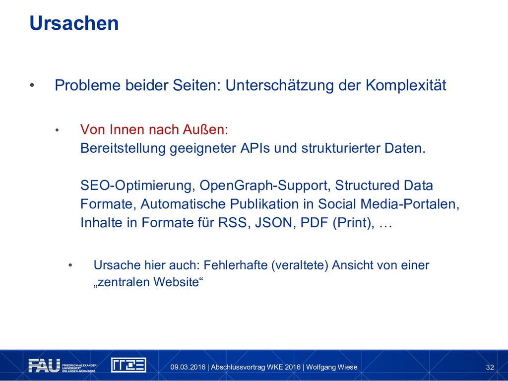 Innen nach Außen: Bereitstellung geeigneter APIs und strukturierter Daten. SEO-Optimierung, OpenGraph-Support, Structured Data Formate, Automatische Publikation in Social Media-Portalen, Inhalte in Formate für RSS, JSON, PDF (Print), … • Ursache hier auch: Fehlerhafte (veraltete) Ansicht von einer „zentralen Website“ Ursachen 09.03.2016 | Abschlussvortrag WKE 2016 | Wolfgang Wiese