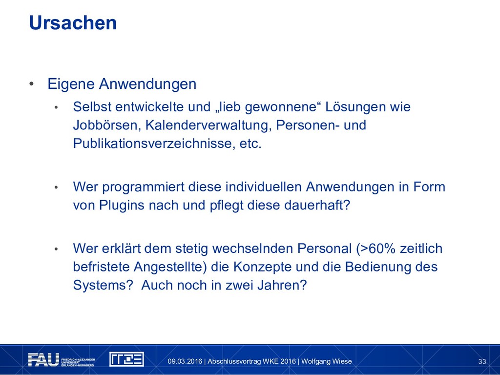Lösungen wie Jobbörsen, Kalenderverwaltung, Personen- und Publikationsverzeichnisse, etc. • Wer programmiert diese individuellen Anwendungen in Form von Plugins nach und pflegt diese dauerhaft? • Wer erklärt dem stetig wechselnden Personal (>60% zeitlich befristete Angestellte) die Konzepte und die Bedienung des Systems? Auch noch in zwei Jahren? Ursachen 09.03.2016 | Abschlussvortrag WKE 2016 | Wolfgang Wiese