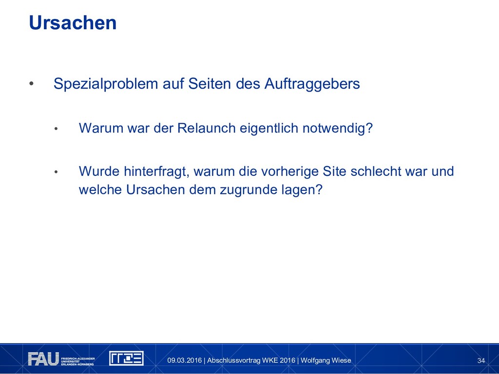 der Relaunch eigentlich notwendig? • Wurde hinterfragt, warum die vorherige Site schlecht war und welche Ursachen dem zugrunde lagen? Ursachen 09.03.2016 | Abschlussvortrag WKE 2016 | Wolfgang Wiese