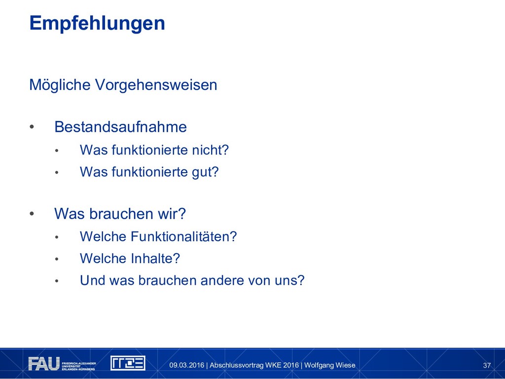 Was funktionierte gut? • Was brauchen wir? • Welche Funktionalitäten? • Welche Inhalte? • Und was brauchen andere von uns? Empfehlungen 09.03.2016 | Abschlussvortrag WKE 2016 | Wolfgang Wiese