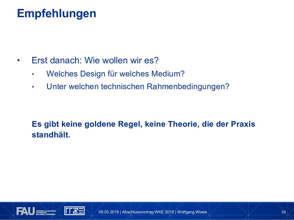 Design für welches Medium? • Unter welchen technischen Rahmenbedingungen? Es gibt keine goldene Regel, keine Theorie, die der Praxis standhält. Empfehlungen 09.03.2016 | Abschlussvortrag WKE 2016 | Wolfgang Wiese