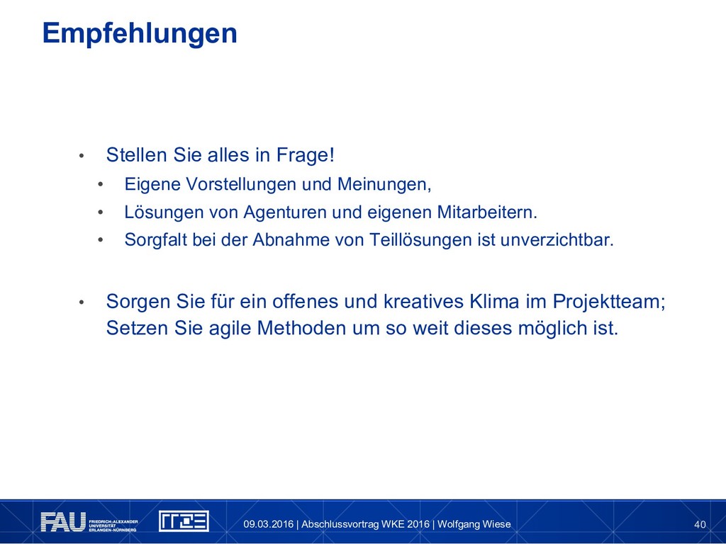 und Meinungen, • Lösungen von Agenturen und eigenen Mitarbeitern. • Sorgfalt bei der Abnahme von Teillösungen ist unverzichtbar. • Sorgen Sie für ein offenes und kreatives Klima im Projektteam; Setzen Sie agile Methoden um so weit dieses möglich ist. Empfehlungen 09.03.2016 | Abschlussvortrag WKE 2016 | Wolfgang Wiese