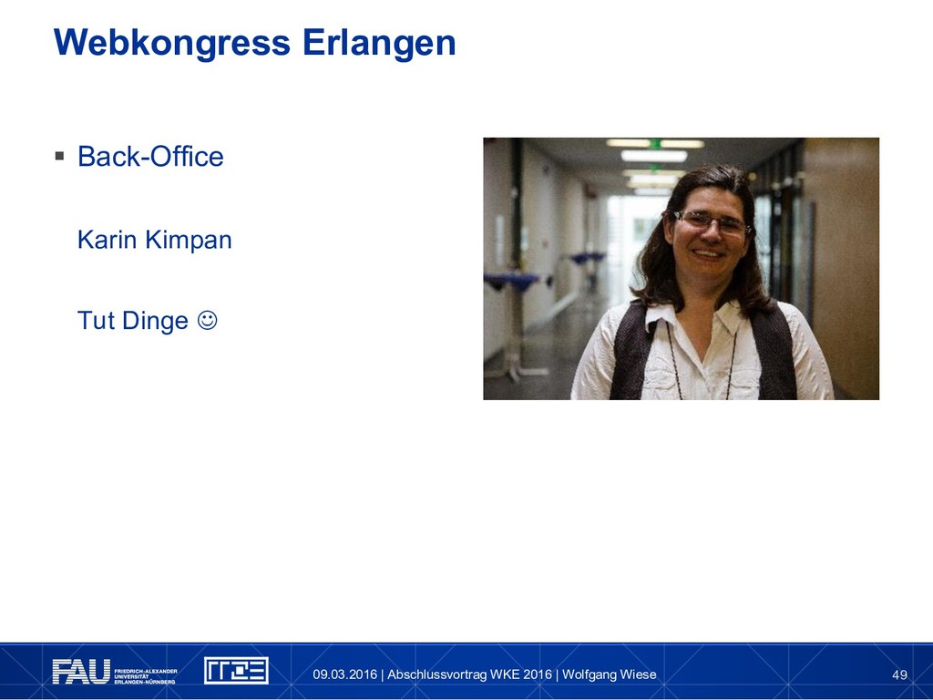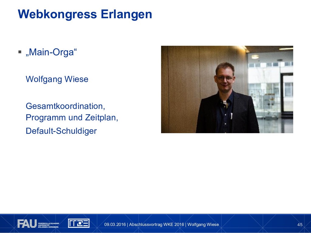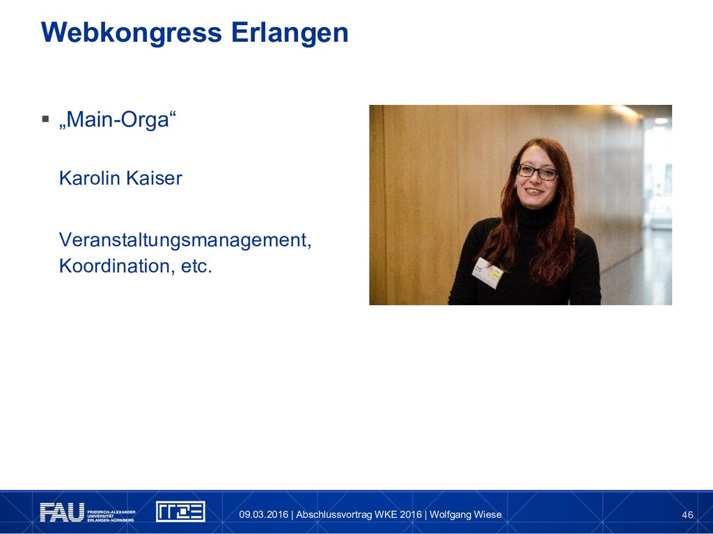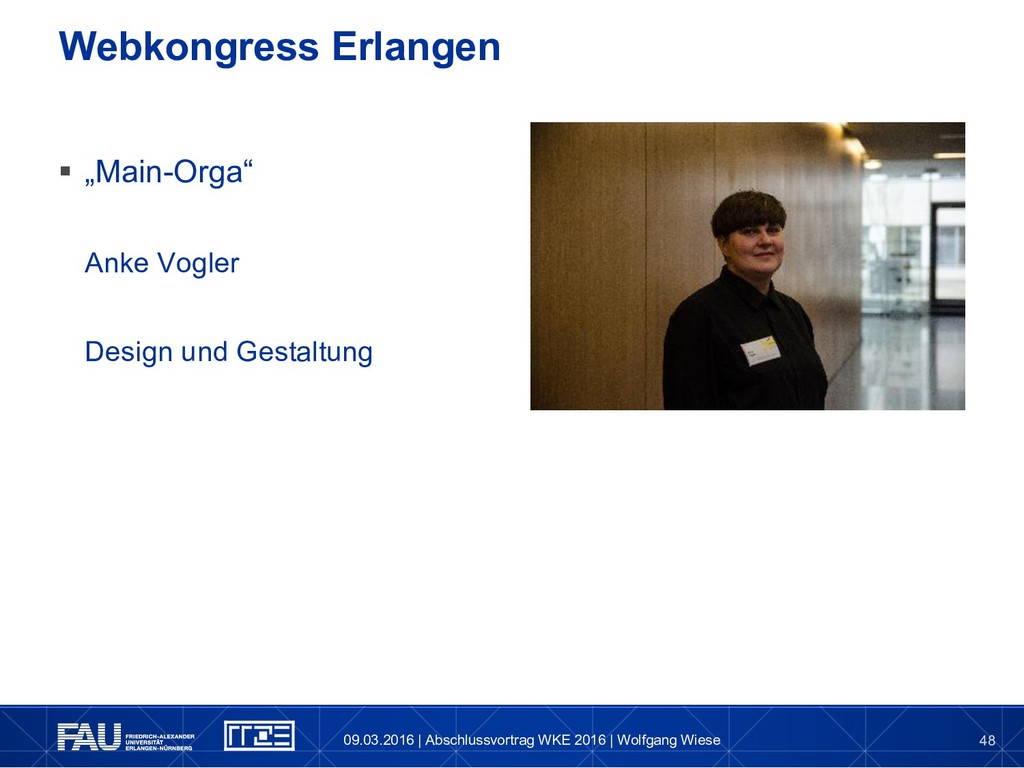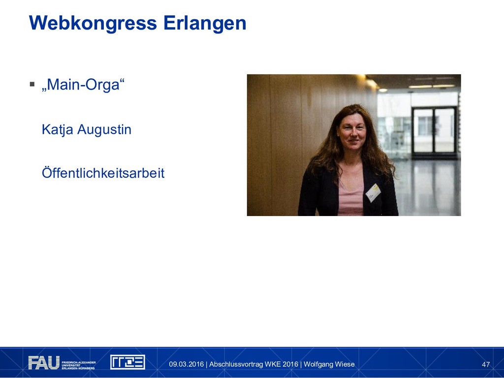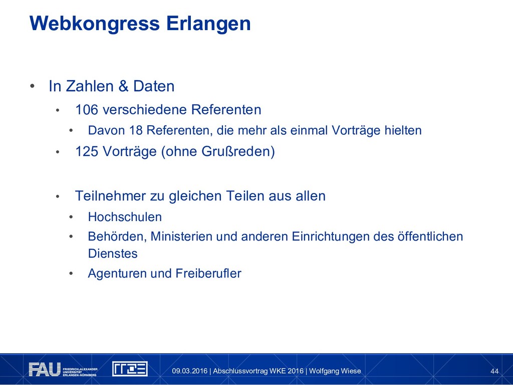 • Davon 18 Referenten, die mehr als einmal Vorträge hielten • 125 Vorträge (ohne Grußreden) • Teilnehmer zu gleichen Teilen aus allen • Hochschulen • Behörden, Ministerien und anderen Einrichtungen des öffentlichen Dienstes • Agenturen und Freiberufler Webkongress Erlangen 09.03.2016 | Abschlussvortrag WKE 2016 | Wolfgang Wiese