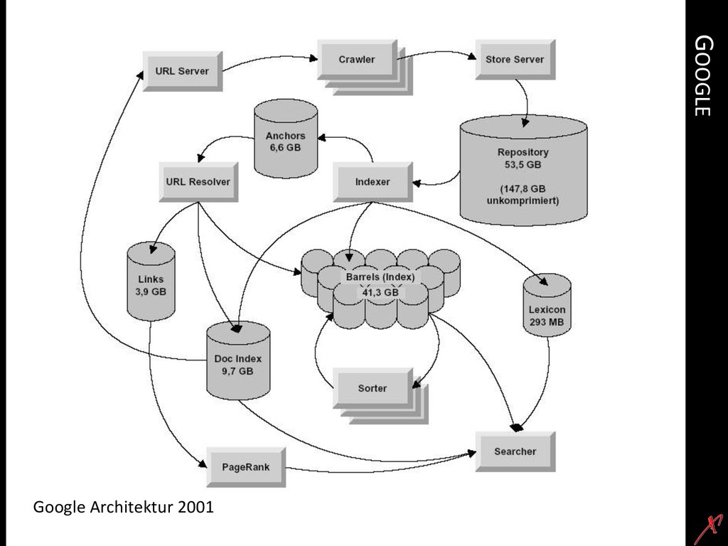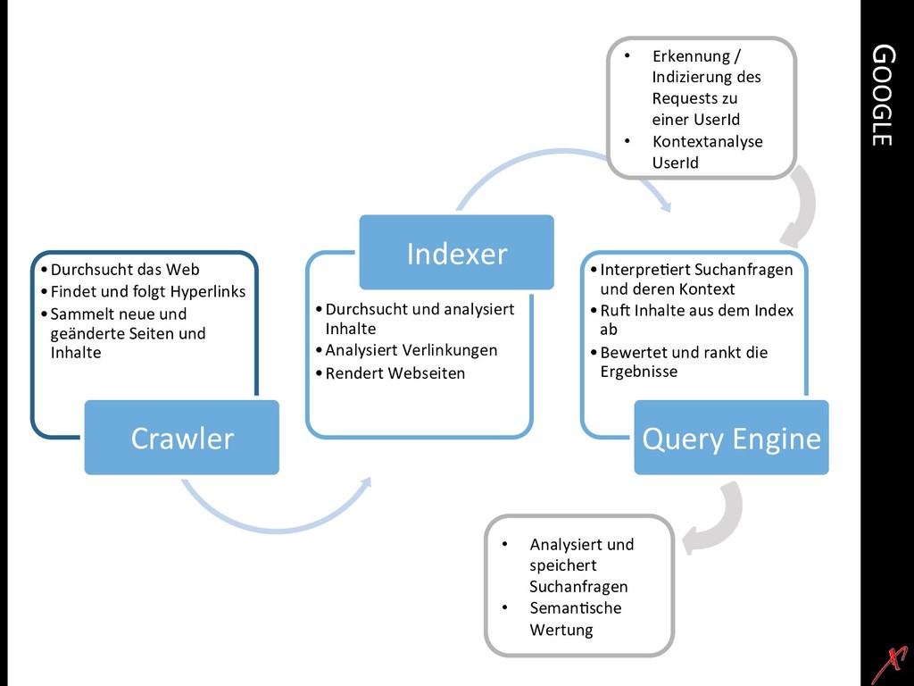 und geänderte Seiten und Inhalte Crawler • Durchsucht und analysiert Inhalte • Analysiert Verlinkungen • Rendert Webseiten Indexer • InterpreQert Suchanfragen und deren Kontext • RuS Inhalte aus dem Index ab • Bewertet und rankt die Ergebnisse Query Engine • Erkennung / Indizierung des Requests zu einer UserId • Kontextanalyse UserId • Analysiert und speichert Suchanfragen • SemanQsche Wertung