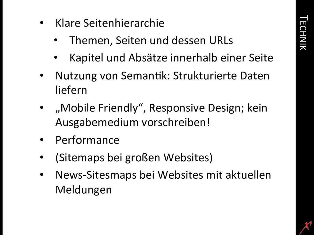 • Kapitel und Absätze innerhalb einer Seite • Nutzung von SemanQk: Strukturierte Daten liefern • „Mobile Friendly“, Responsive Design; kein Ausgabemedium vorschreiben! • Performance • (Sitemaps bei großen Websites) • News-Sitesmaps bei Websites mit aktuellen Meldungen