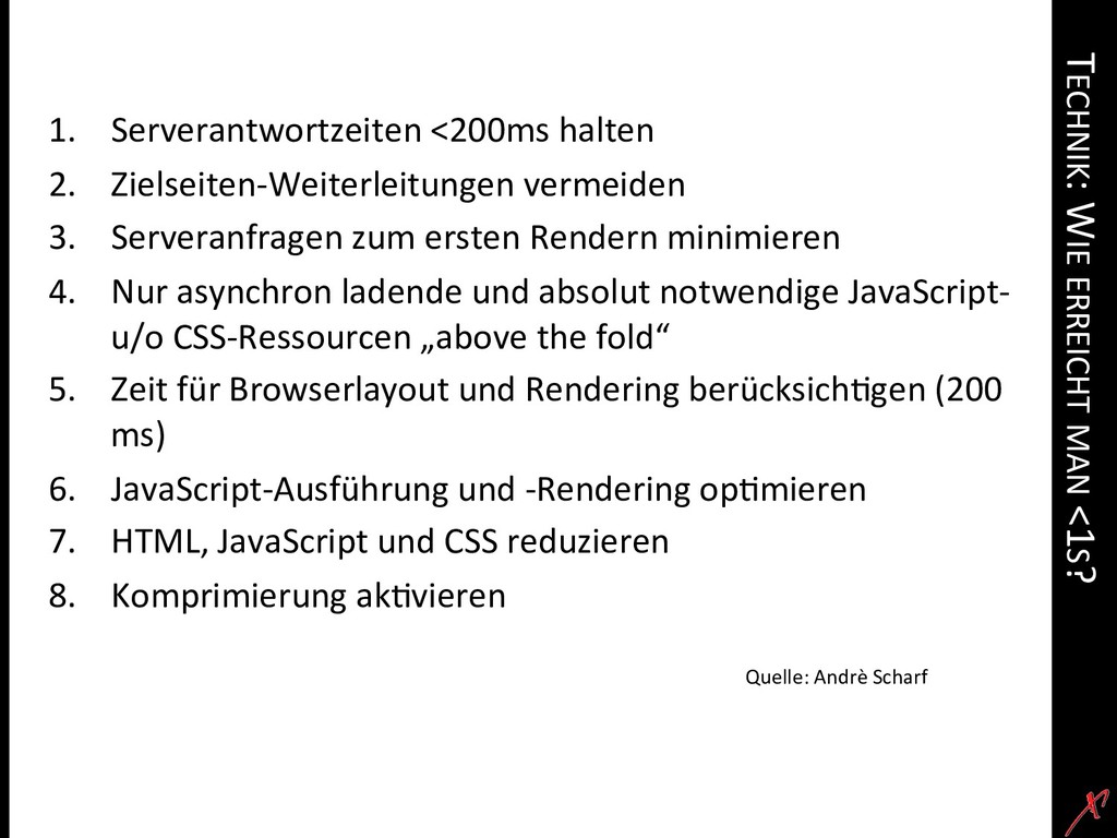 Zielseiten-Weiterleitungen vermeiden 3. Serveranfragen zum ersten Rendern minimieren 4. Nur asynchron ladende und absolut notwendige JavaScript- u/o CSS-Ressourcen „above the fold“ 5. Zeit für Browserlayout und Rendering berücksichQgen (200 ms) 6. JavaScript-Ausführung und -Rendering opQmieren 7. HTML, JavaScript und CSS reduzieren 8. Komprimierung akQvieren Quelle: Andrè Scharf
