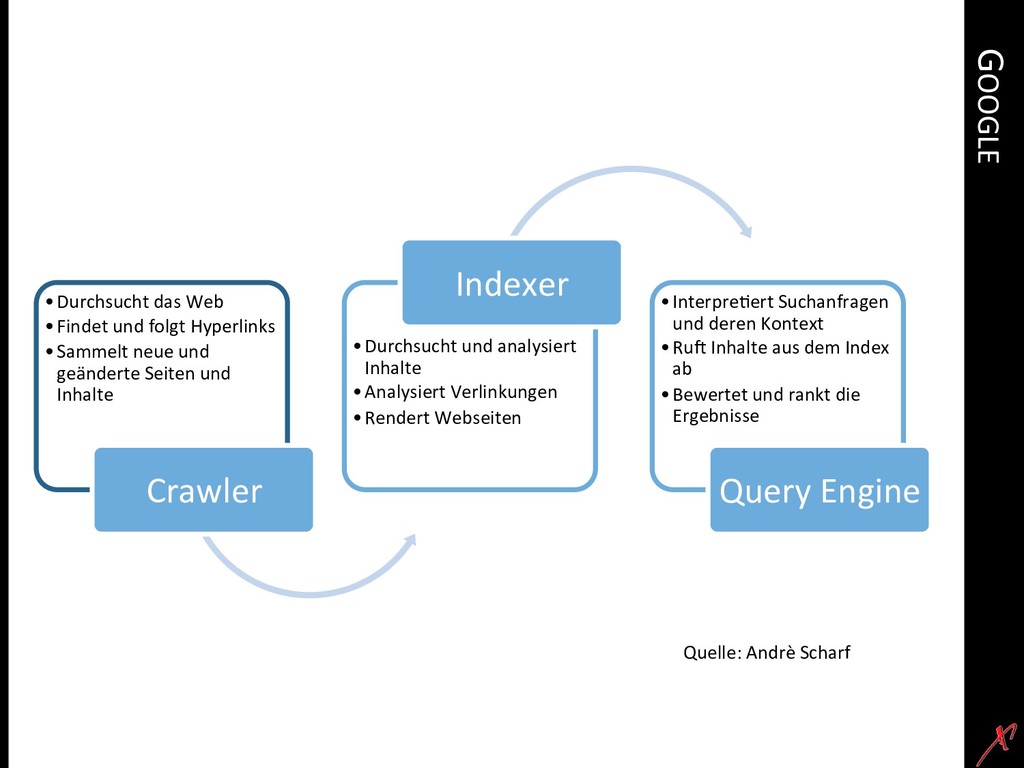 und geänderte Seiten und Inhalte Crawler • Durchsucht und analysiert Inhalte • Analysiert Verlinkungen • Rendert Webseiten Indexer • InterpreQert Suchanfragen und deren Kontext • RuS Inhalte aus dem Index ab • Bewertet und rankt die Ergebnisse Query Engine Quelle: Andrè Scharf